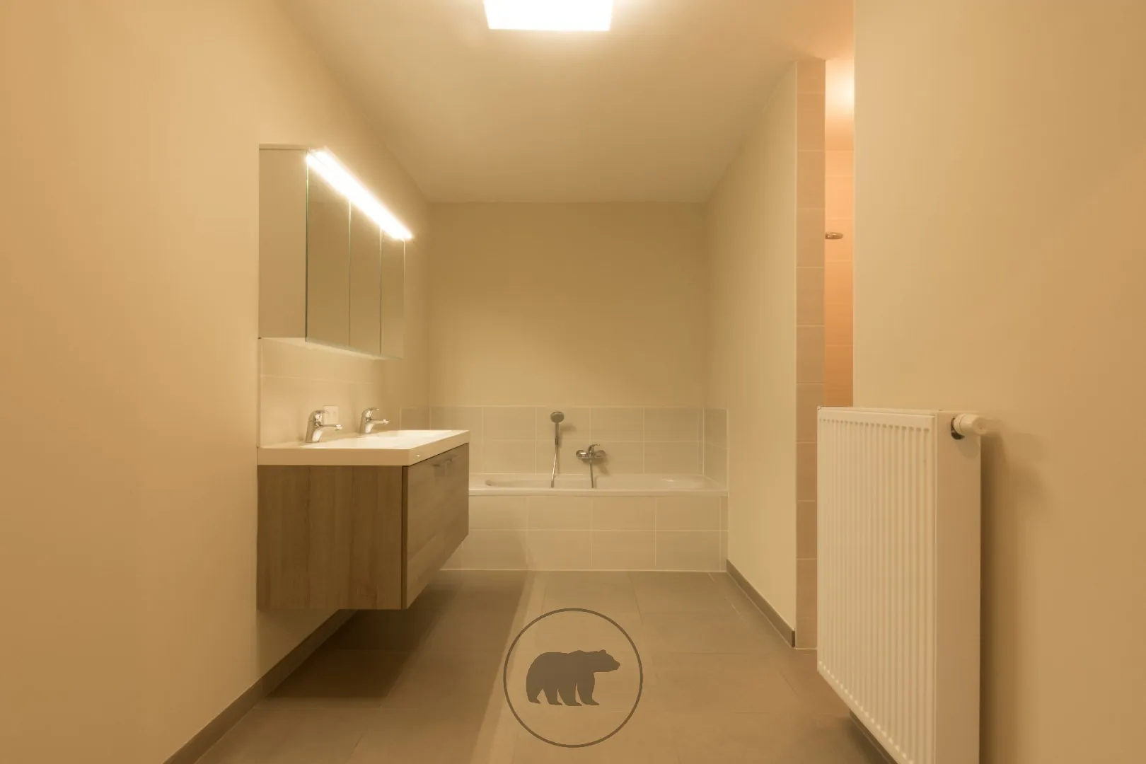 Voorin is er een inkomhal met gastentoilet en vestiaire. Een ruime eerste kamer voorin kan gebruikt worden als bureel of slaapkamer. Achterin het appartement zijn de twee andere slaapkamers, het nachttoilet en de wasplaats. De badkamer is ook erg ruim met zowel een ligbad als een inloopdouche.