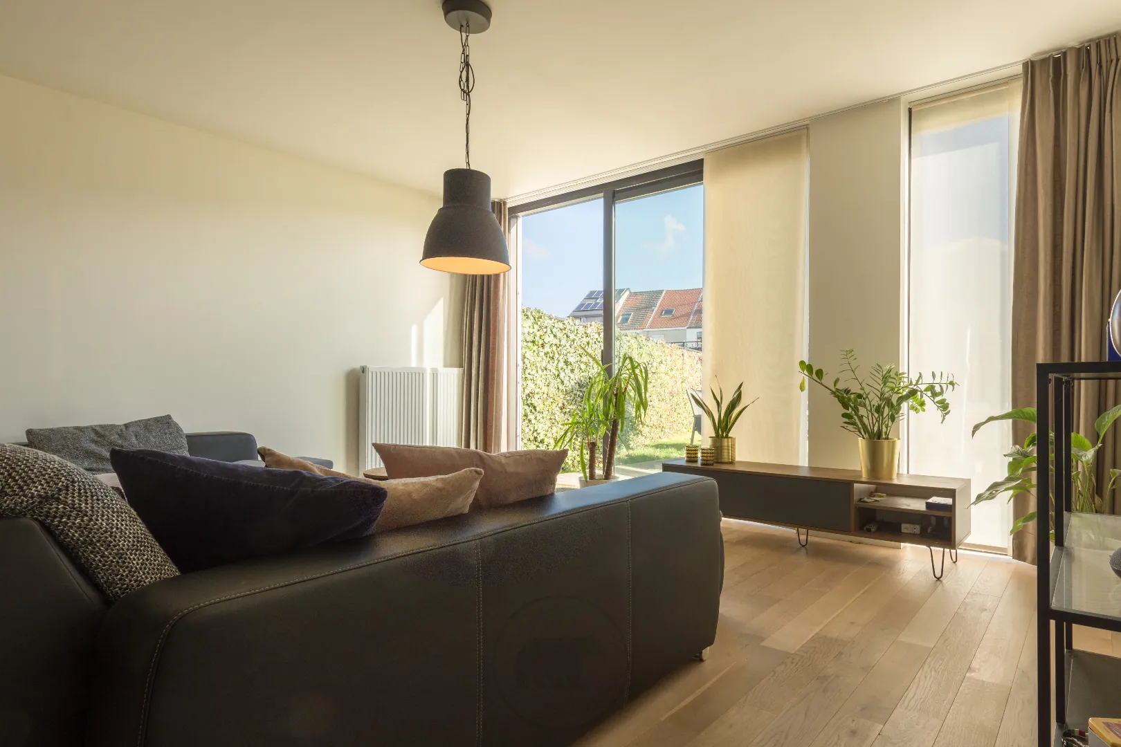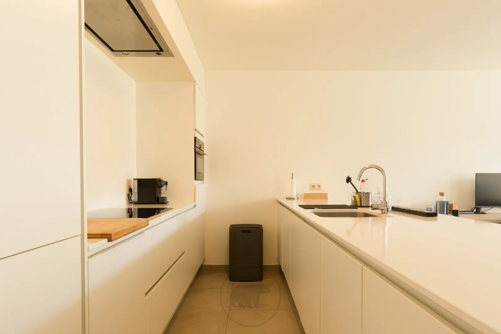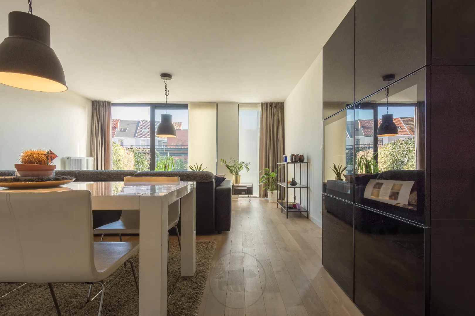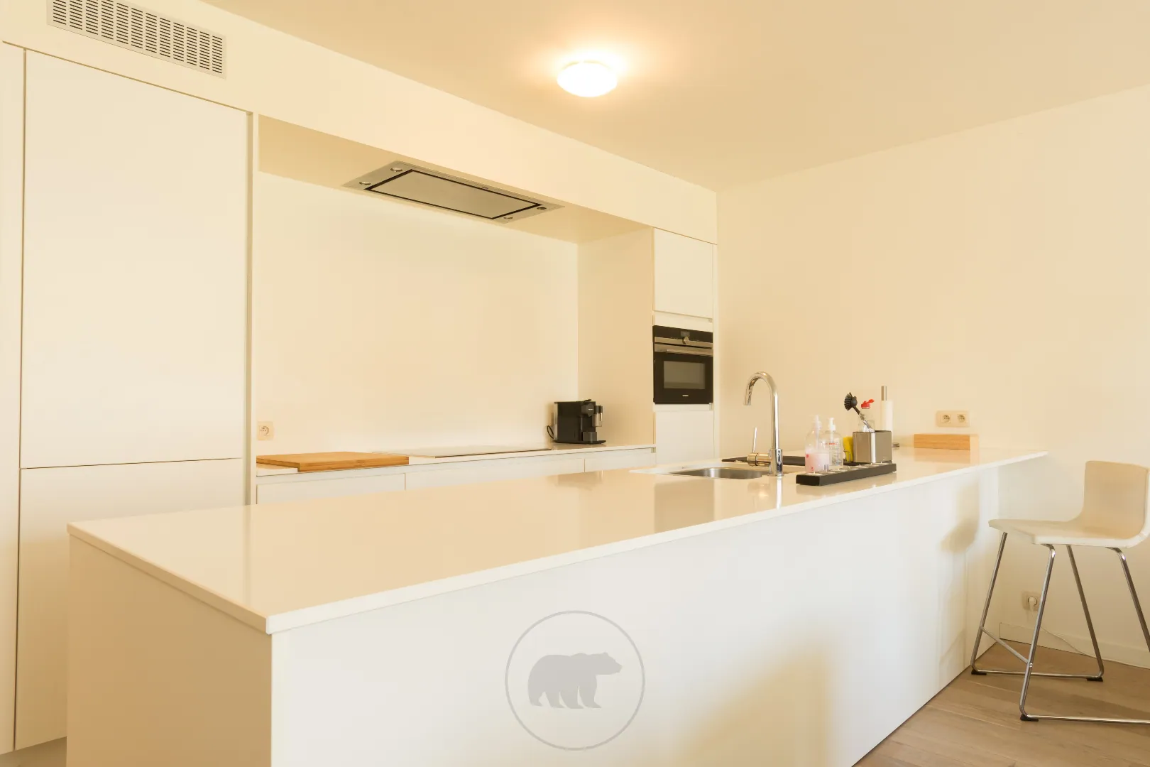 Binnenin is het appartement kwalitatief en tijdloos afgewerkt. Mooie parketvloeren, grote ramen gericht op de tuin en een strakke open keuken met eiland springen direct in het oog.