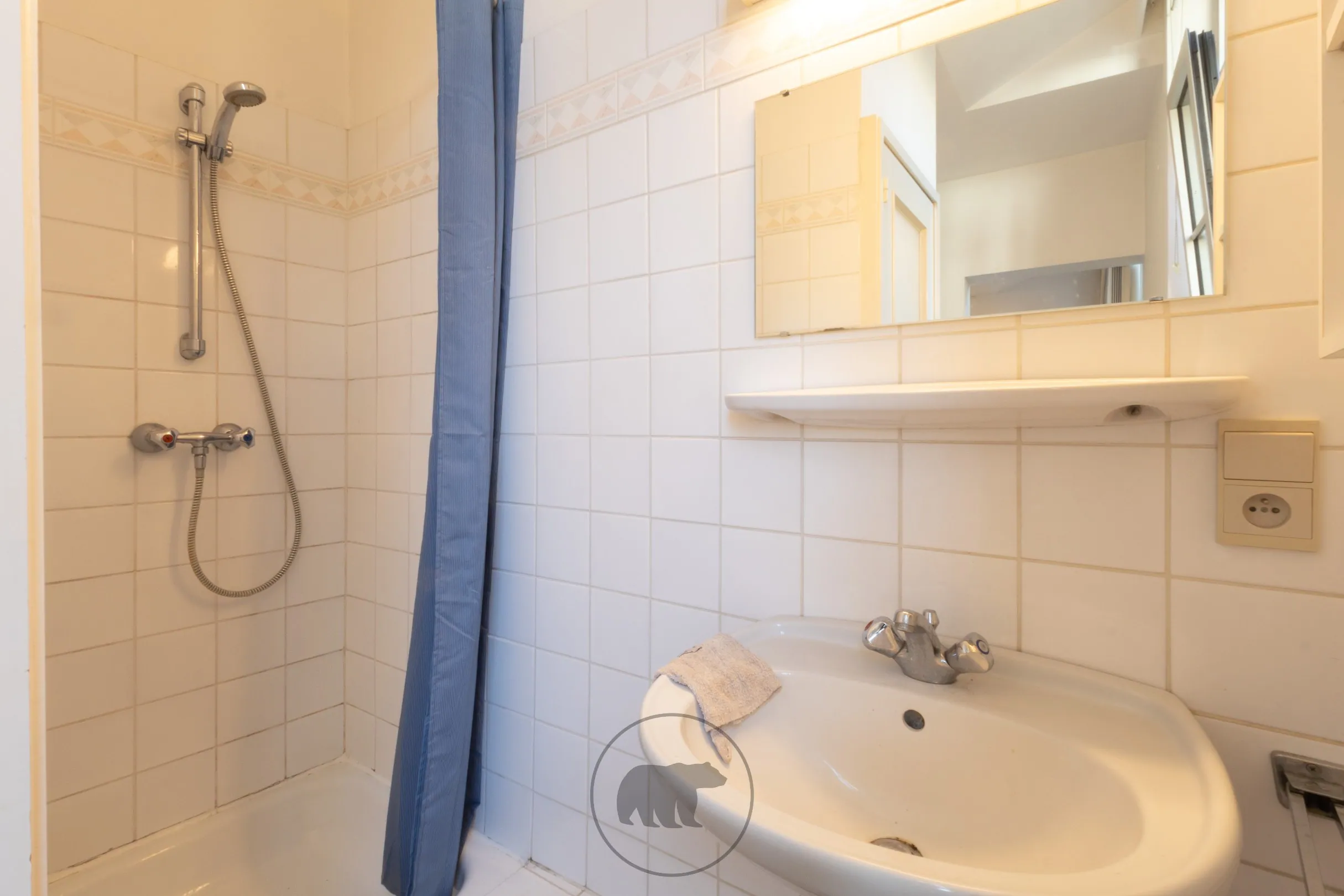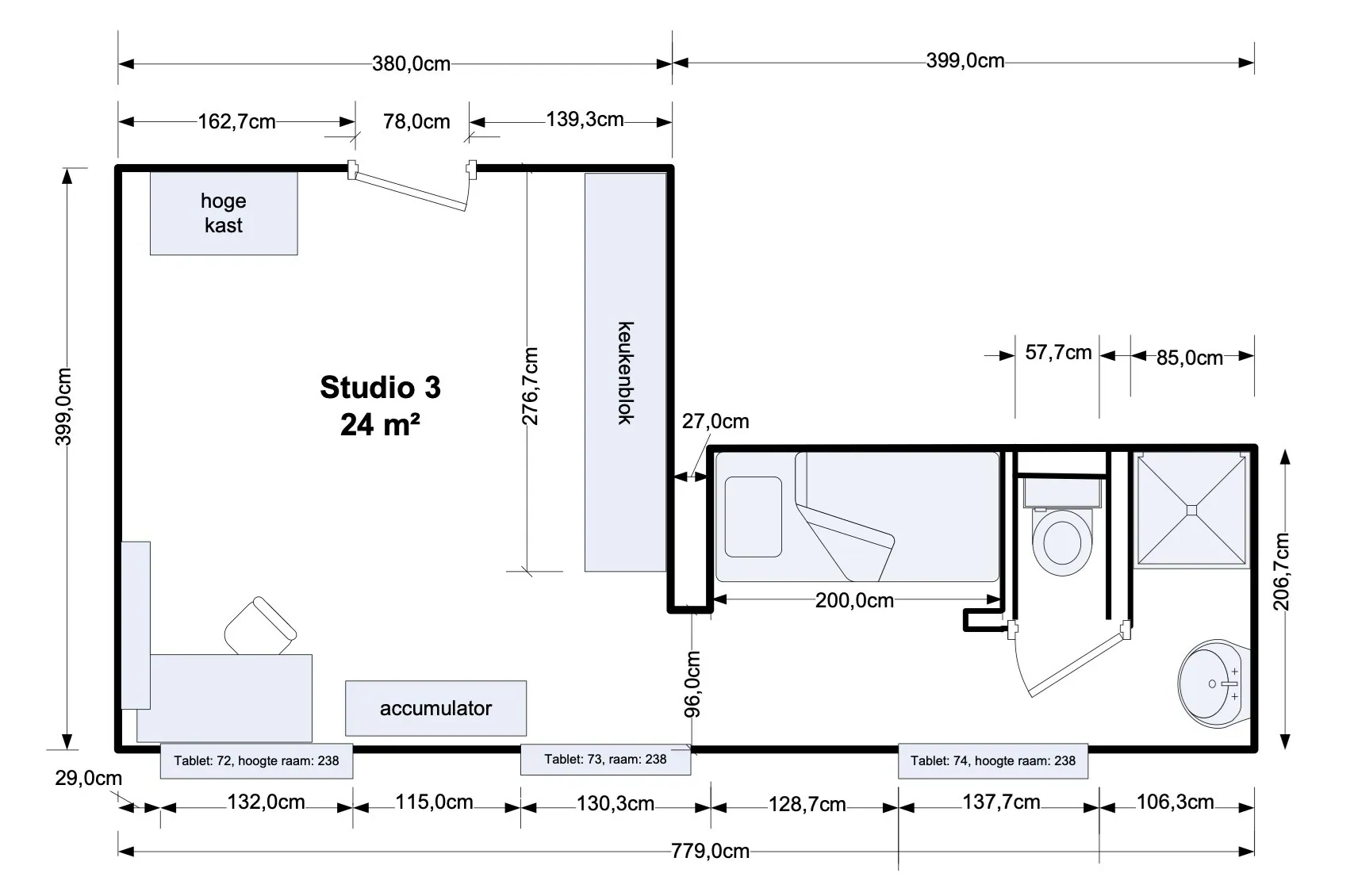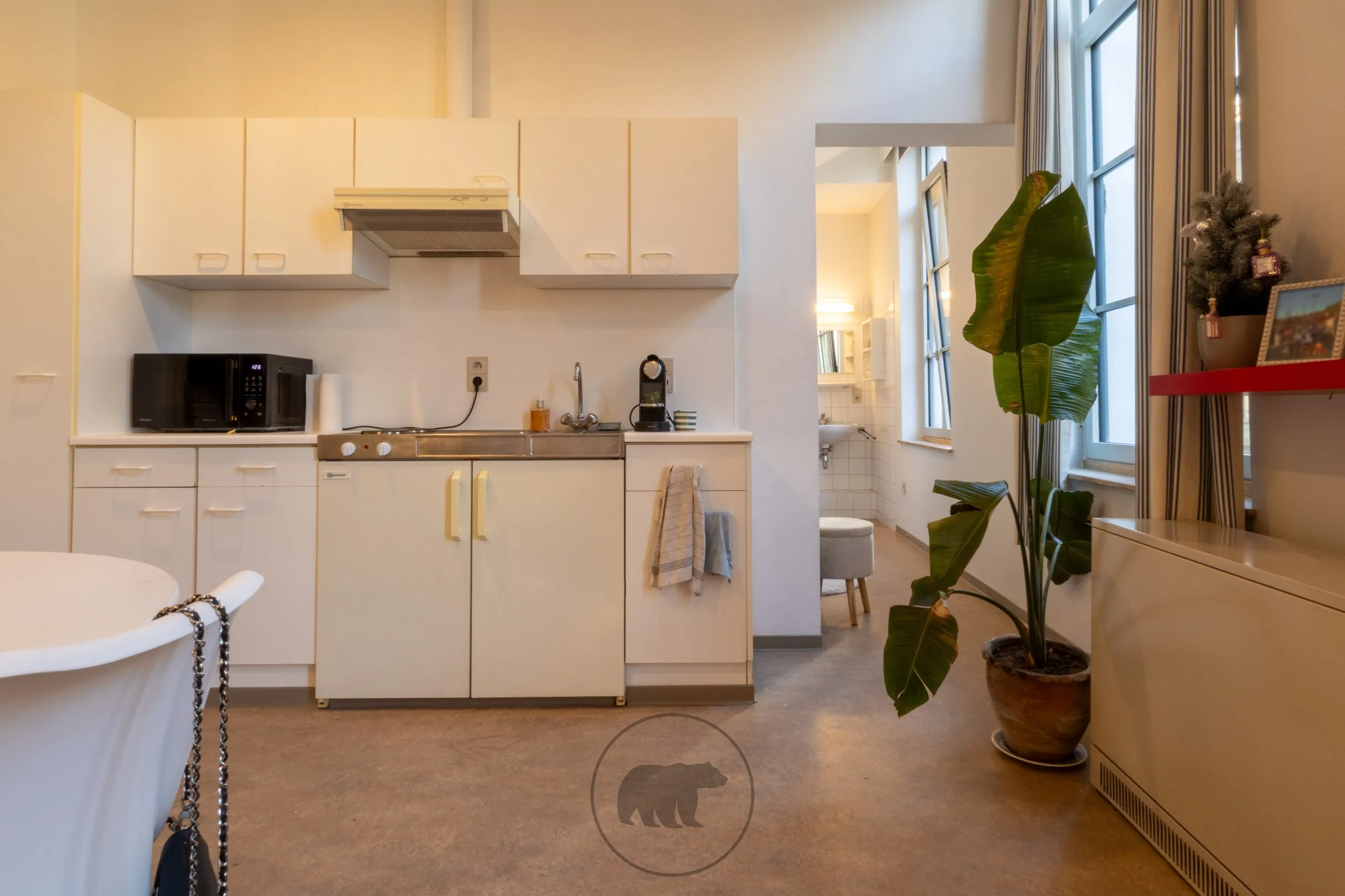 Het slaapgedeelte en doucheruimte liggen afzonderlijk van de leef- en studeerruimte. In de leefruimte is een ingerichte open keuken. Aansluitend op de slaapkamer is er een douche en lavabo. Er is een afzonderlijk afgesloten toilet.