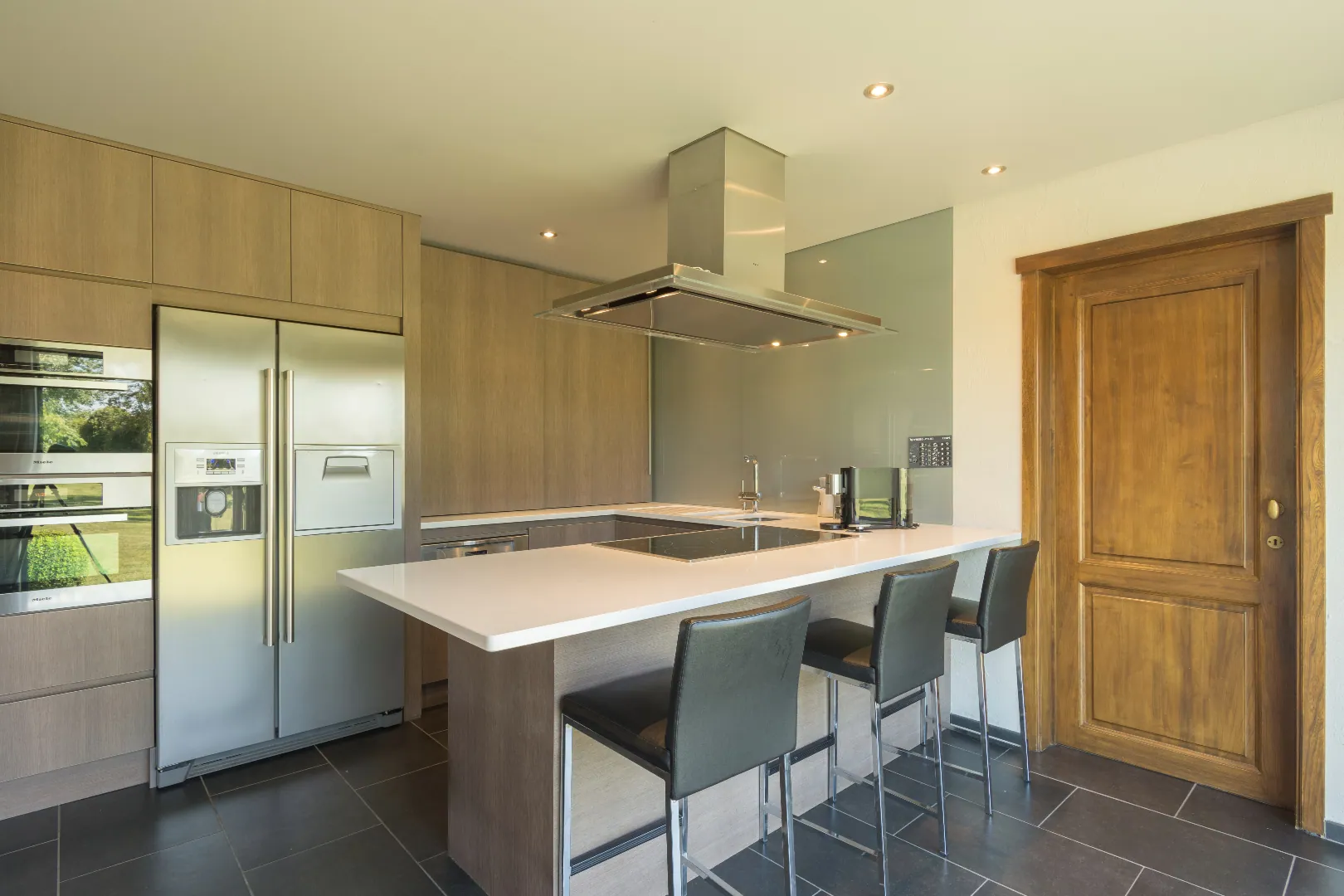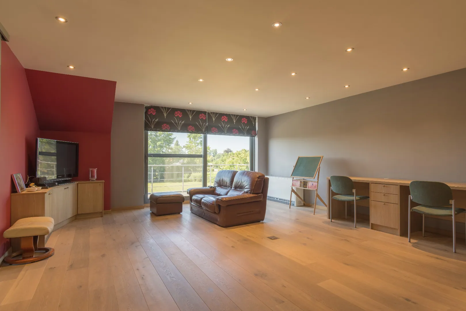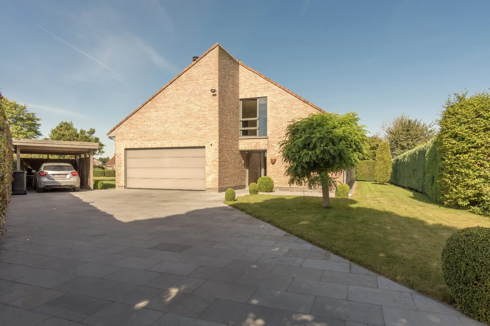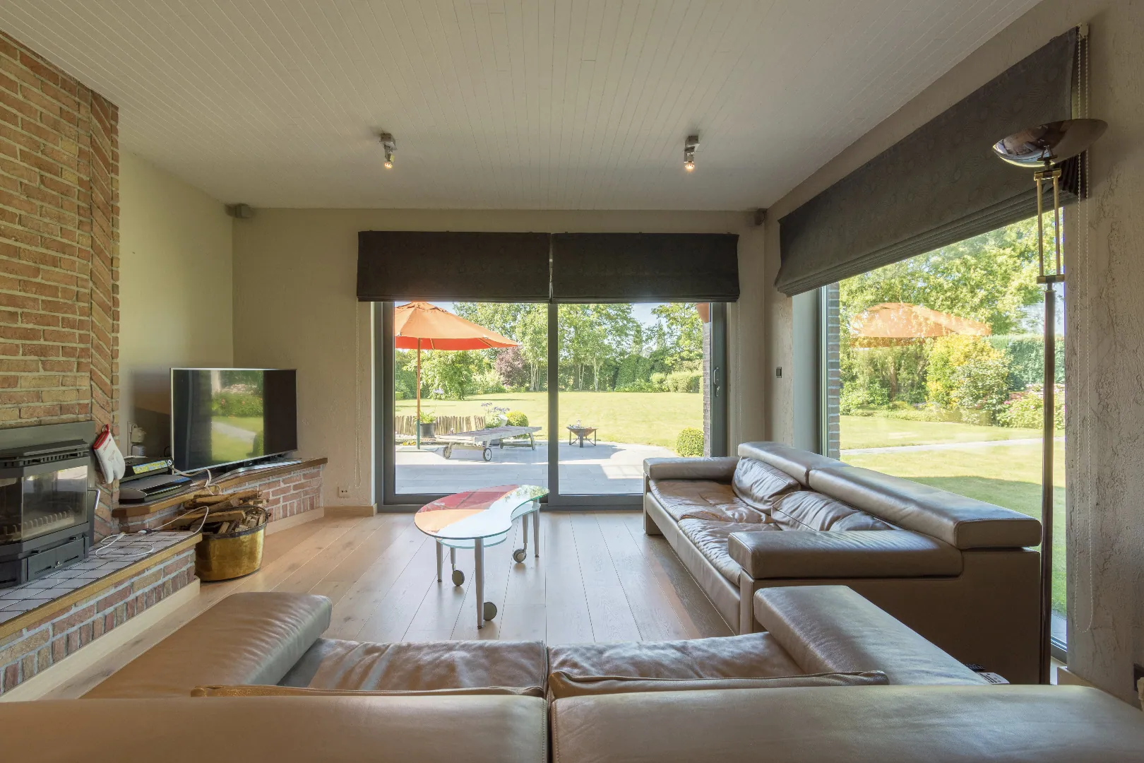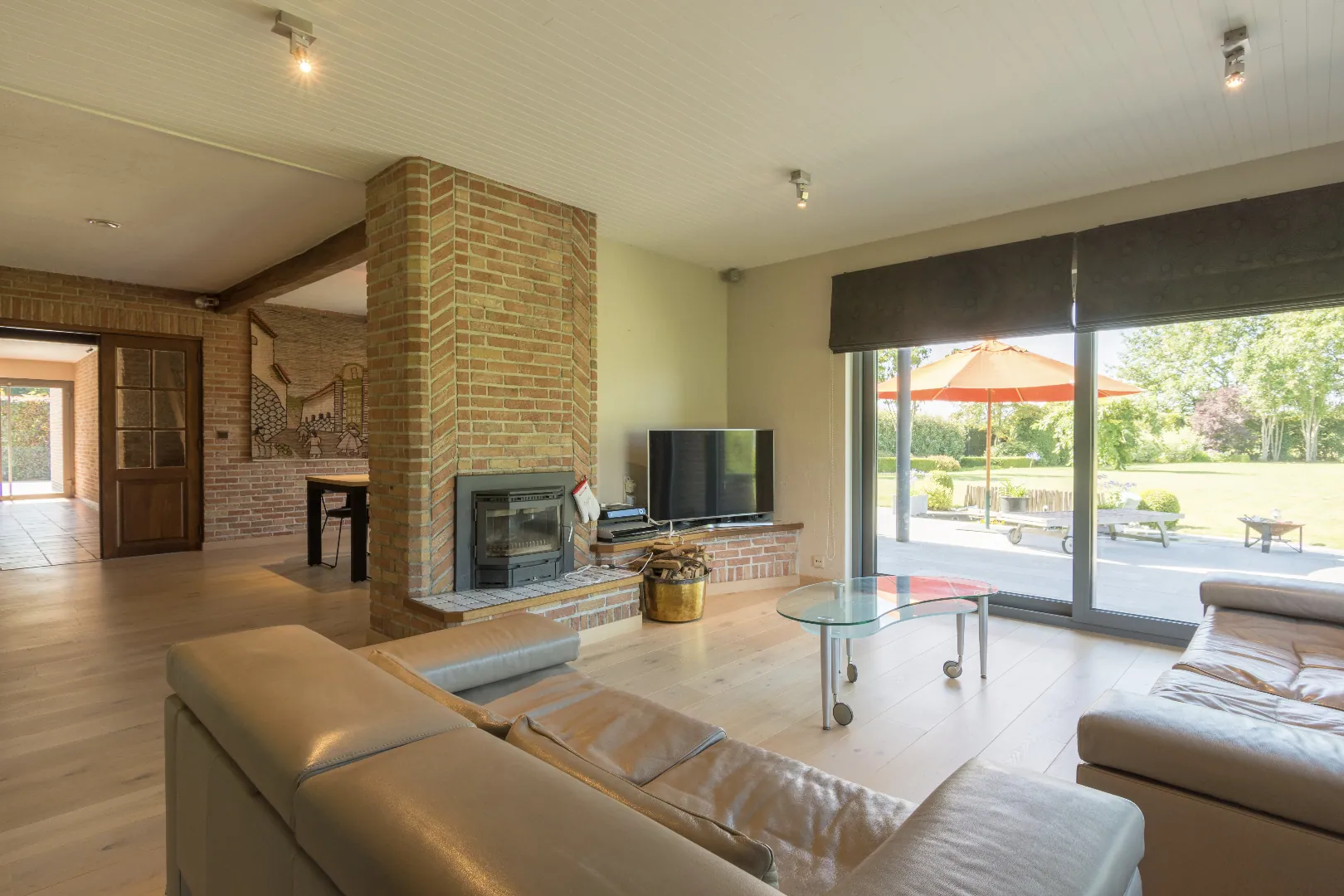 Het gelijkvloers heeft 3 slaapkamers, een leefruimte met haardvuur en eetplaats met open keuken. Er is ook een dubbele garage met berging.