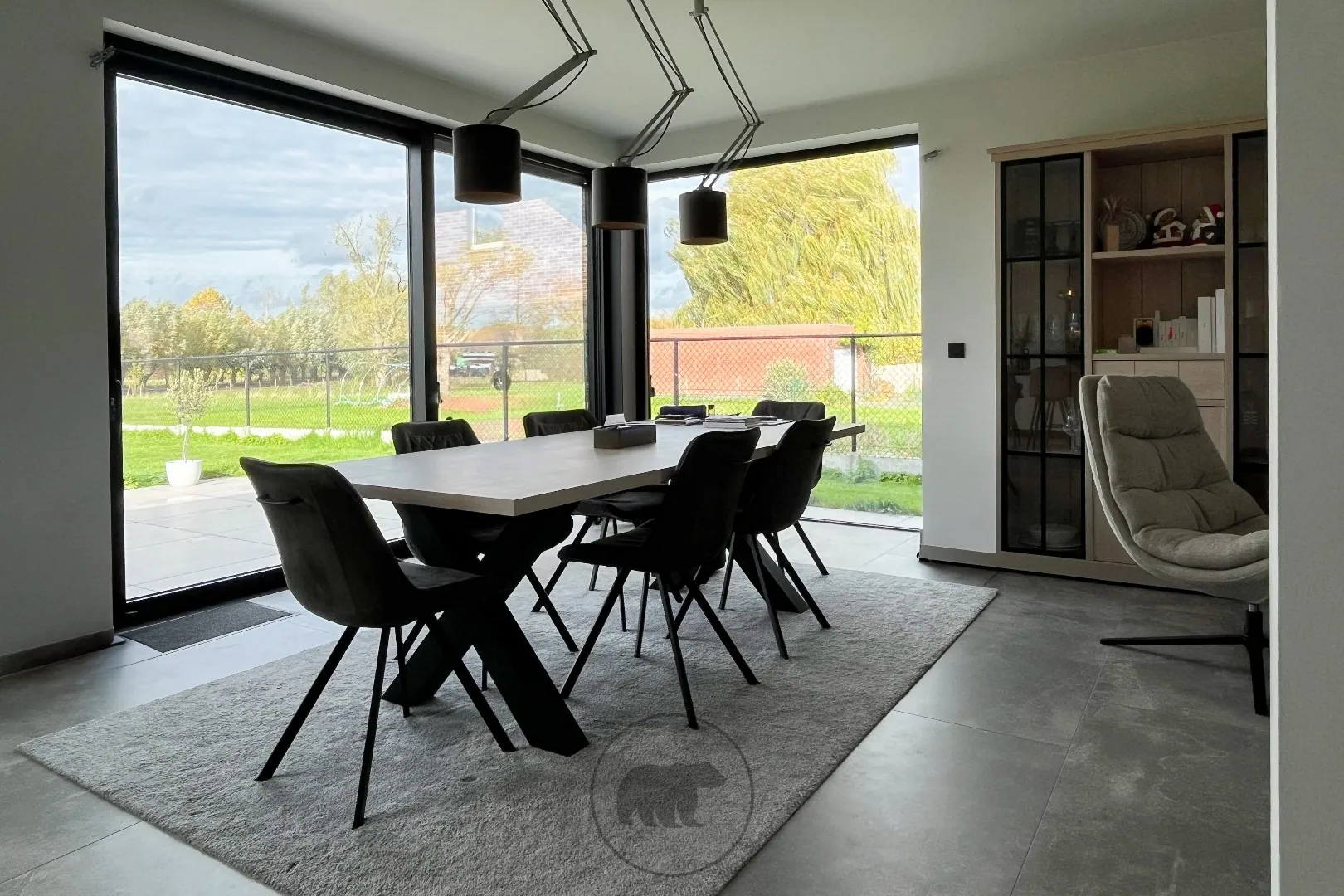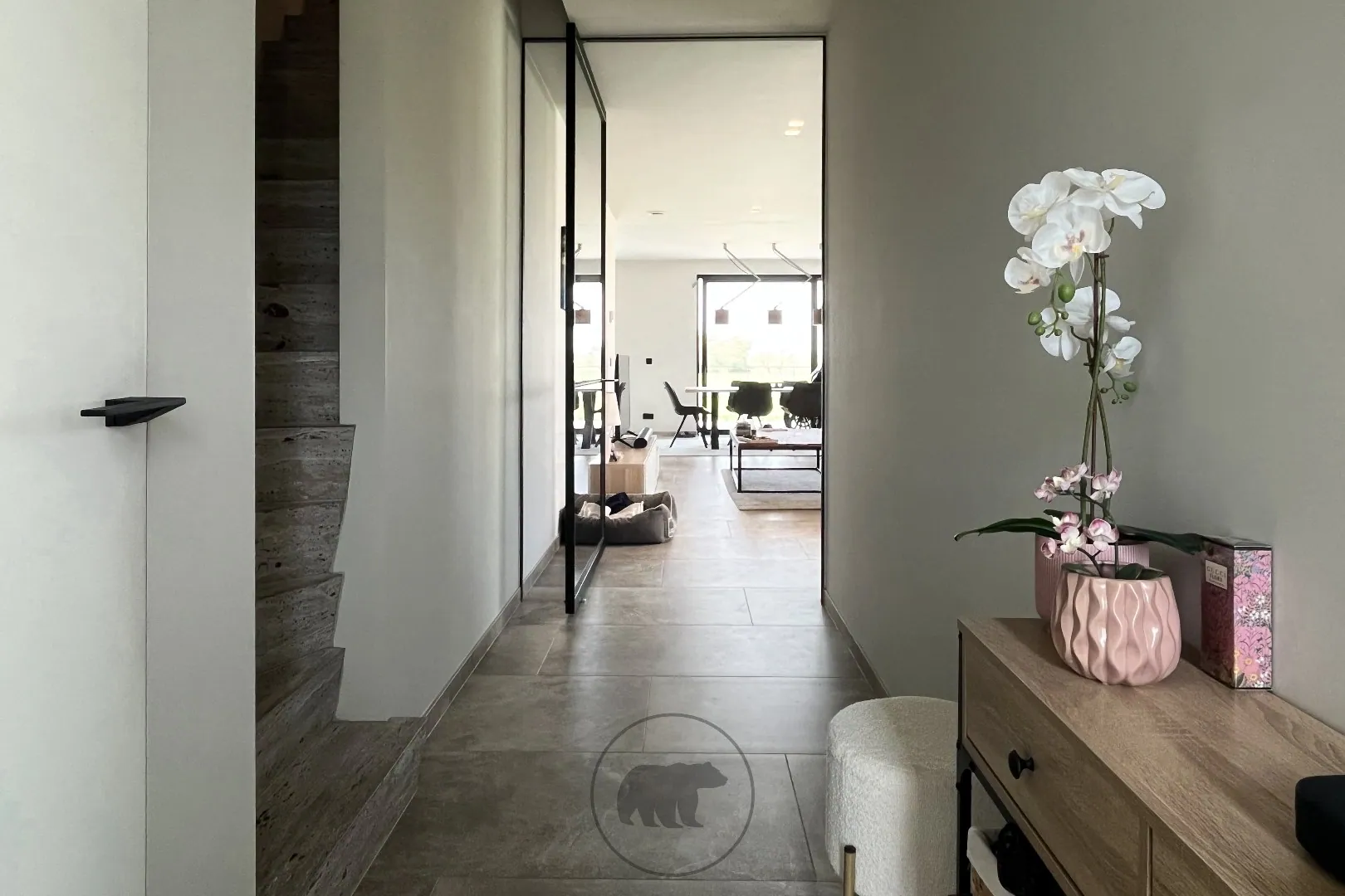 Grote glaspartijen zorgen voor een erg lichtrijke woning met aangename leefruimtes. De inkomhal met gastentoilet biedt via een glazen deur toegang tot de living. Aansluitend is er een afzonderlijk bureel. De living loopt over in de prachtige hypergeïnstalleerde keuken.