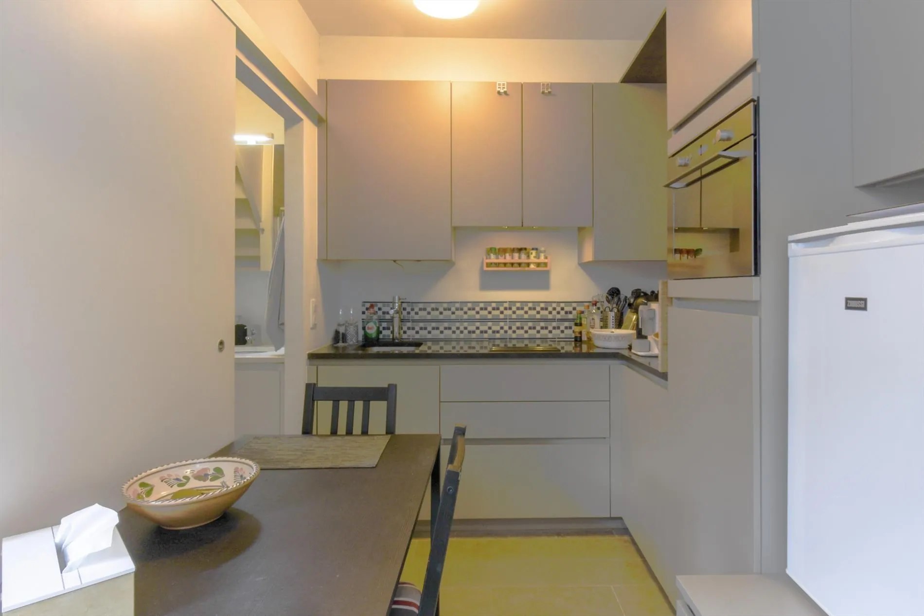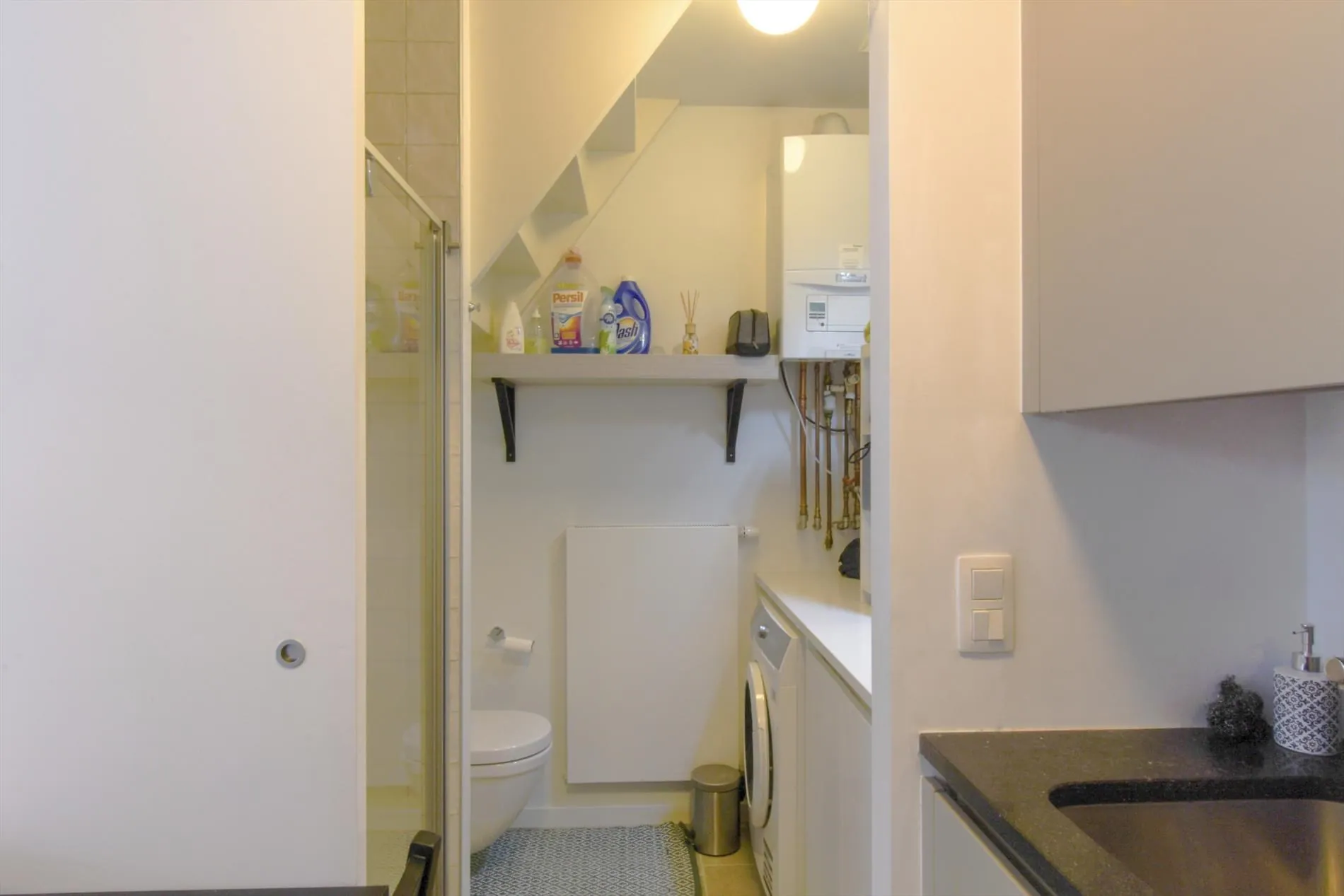 Binnenin is er op het gelijkvloers een leefkeuken met ingerichte toestellen, inclusief vaatwas. De naastgelegen badkamer met douche en toilet heeft overigens de mogelijkheid tot het aansluiten van een wasmachine.