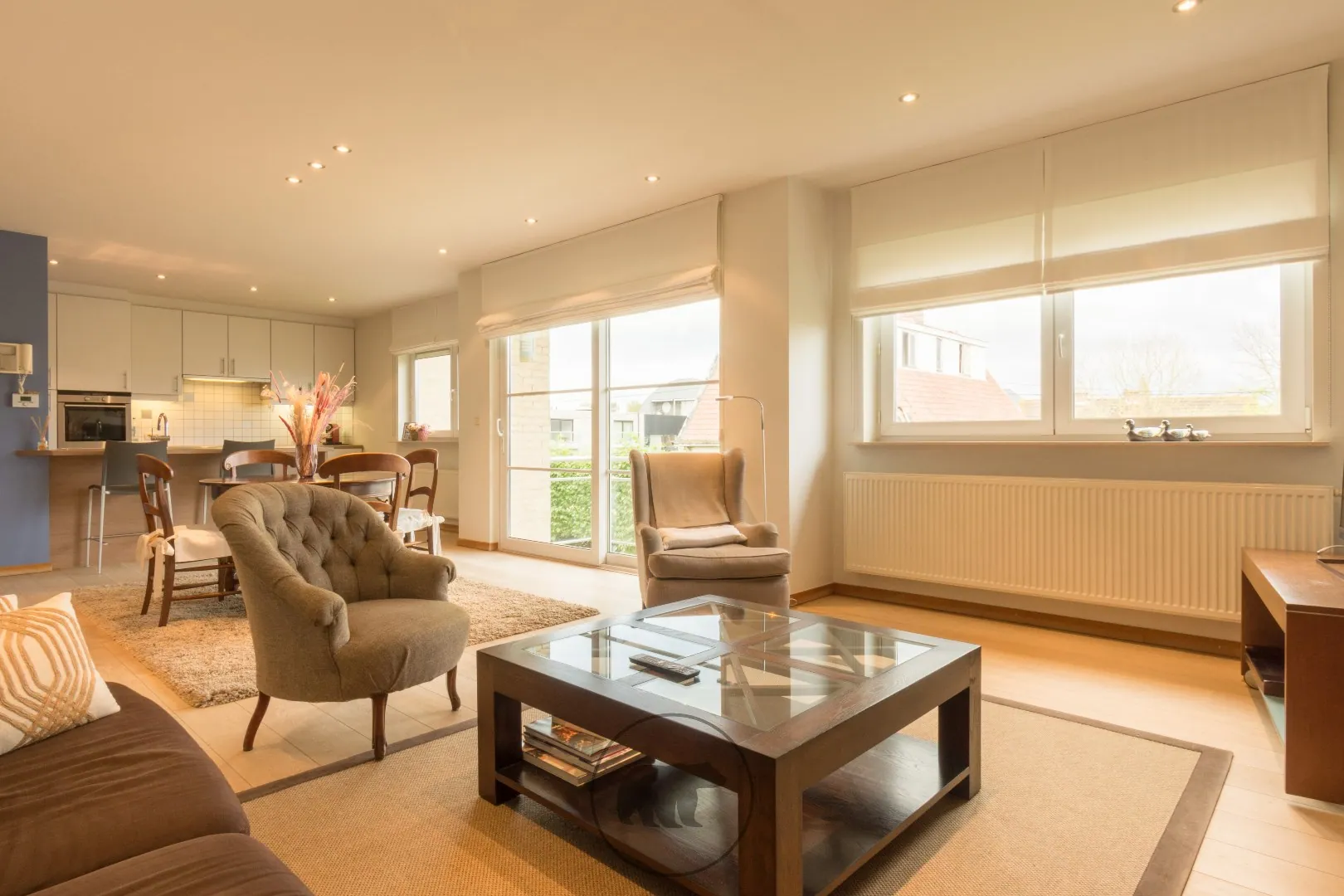 Vanuit de inkomhal met ingebouwde vestiairekast geeft een dubbele glazen deur uit op de leefruimte. Deze leefruimte met parketvloeren bestaat uit de eetplaats met aansluitend het balkon en de living. De open leefkeuken, ingericht met toestellen, is voorzien van heel wat opbergkasten en een keukeneiland met mogelijkheid om aan te zitten.