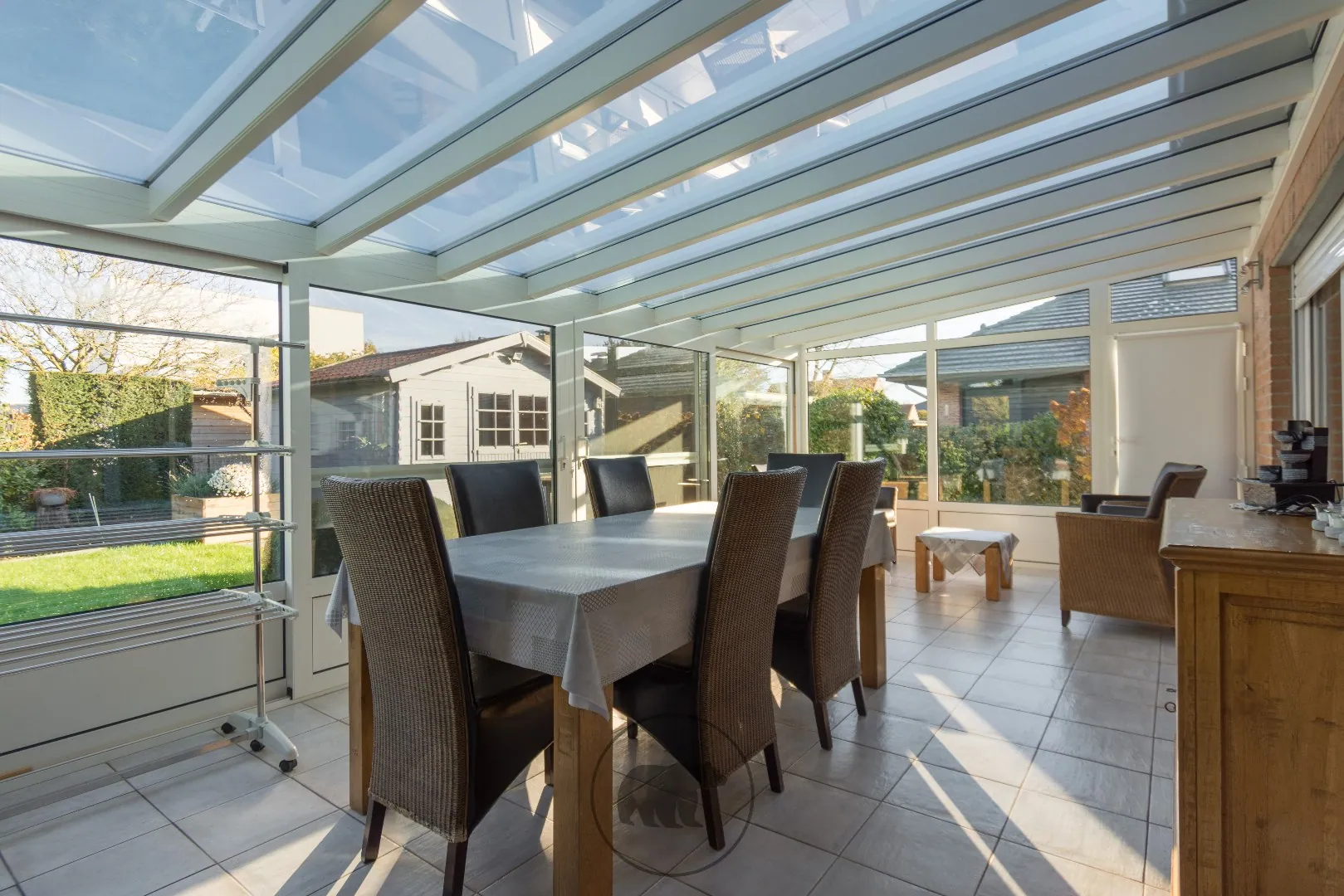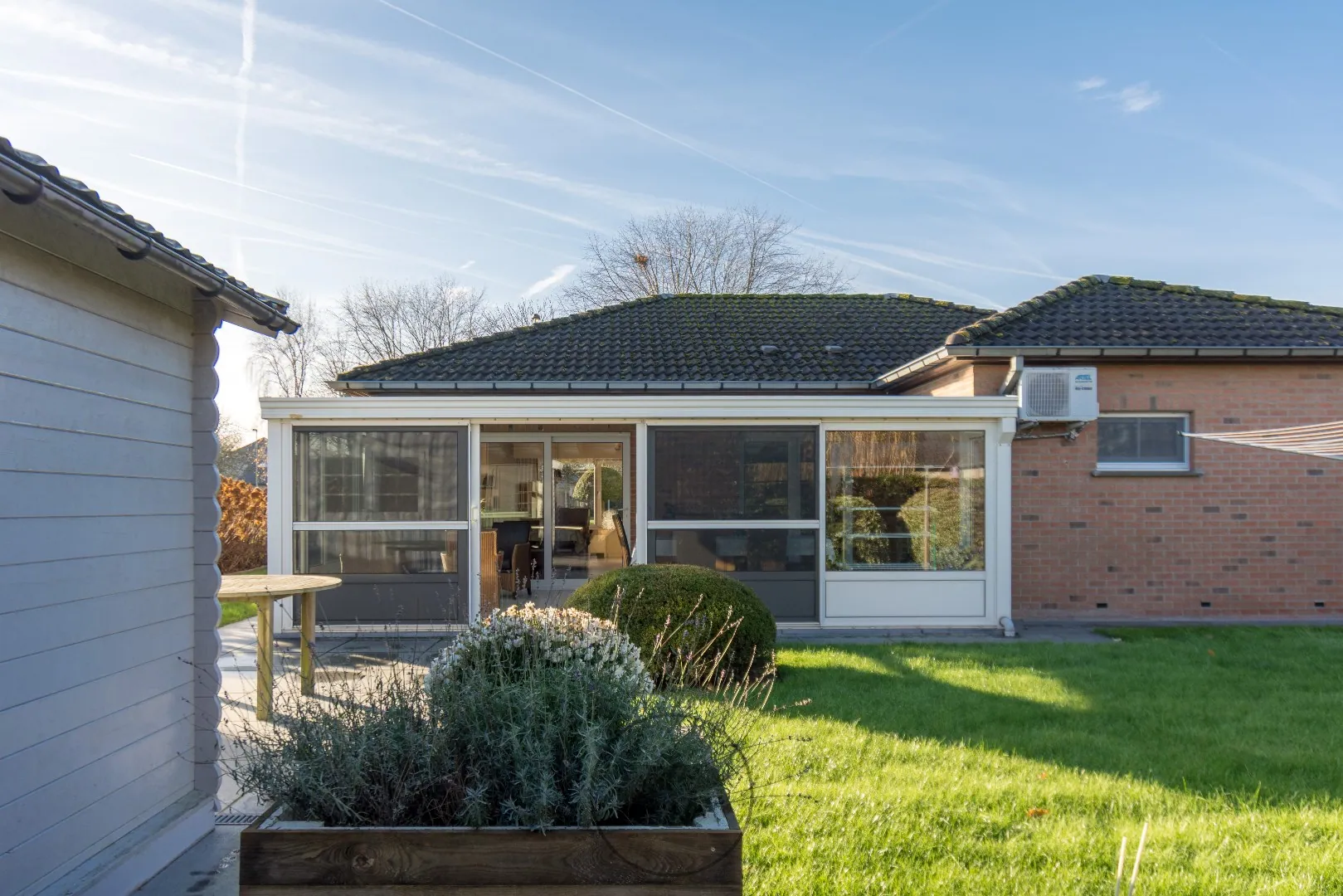 Het perceel van 700 vierkante meter is volledig afgesloten en heeft een erg ruime tuinberging, terras en veranda met warmtepomp unit.