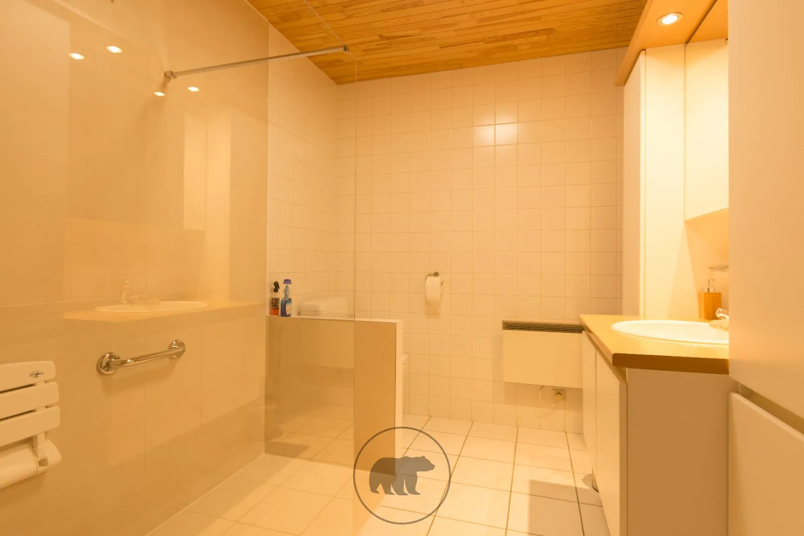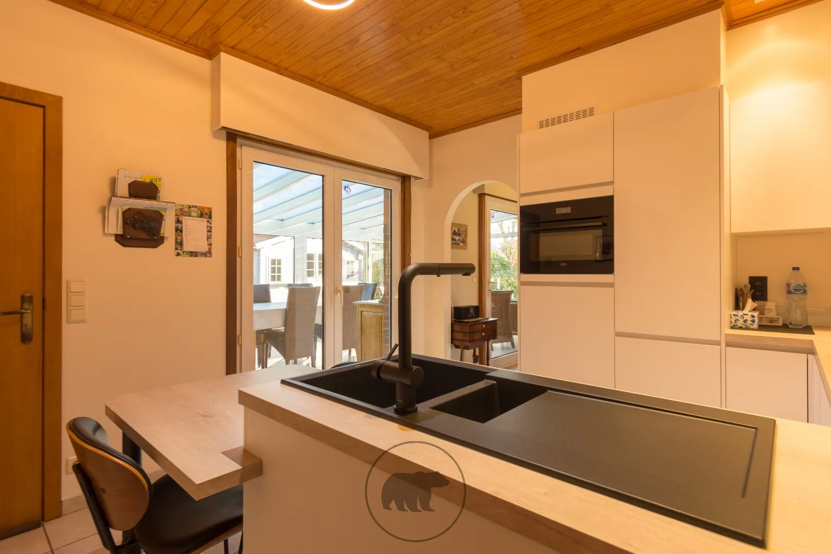 De gesloten leefkeuken is in 2024 volledig vernieuwd. De bijkeuken met inbouwkasten biedt plaats voor de was- en droogmachines, vaatwasmachines en extra frigo of diepvriezers. Aansluitend is er ook een koele berging.