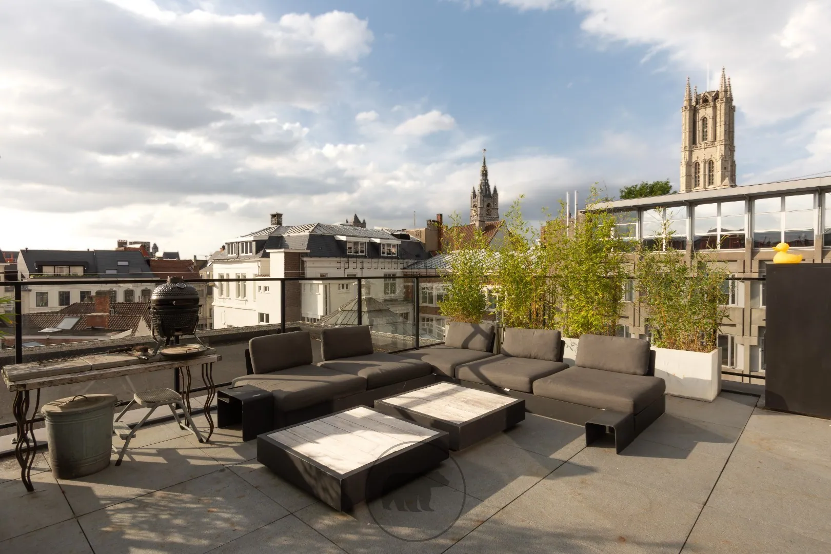 Het prachtige en zonovergoten terras kijkt grotendeels over de daken heen met zicht op de Sint-Niklaaskerk, Het Belfort en de Sint-Baafskathedraal.