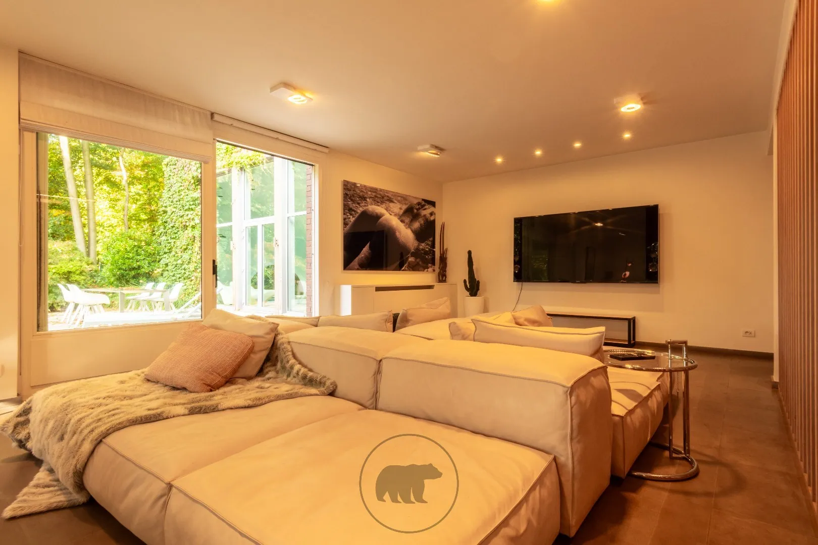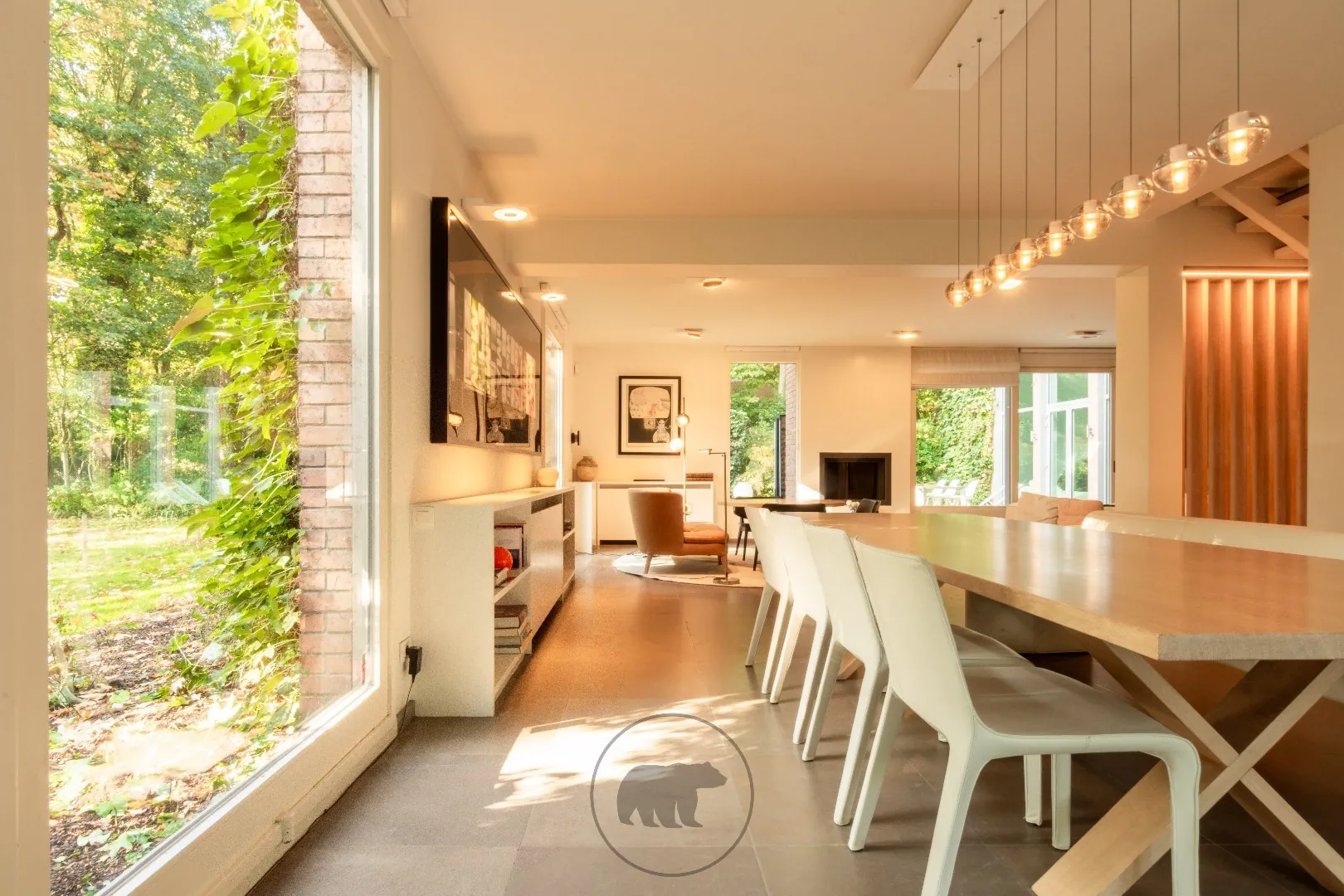 Deze villa naar de hand van architect Philippe Samyn werd gebouwd voor een familielid en kwam later in handen van de huidige eigenaars. De architect combineert strakke architecturale lijnen met grote glaspartijen. Overal kan je genieten van sublieme lichtinval en voelt u zich één met de prachtige natuur die de villa omringt.