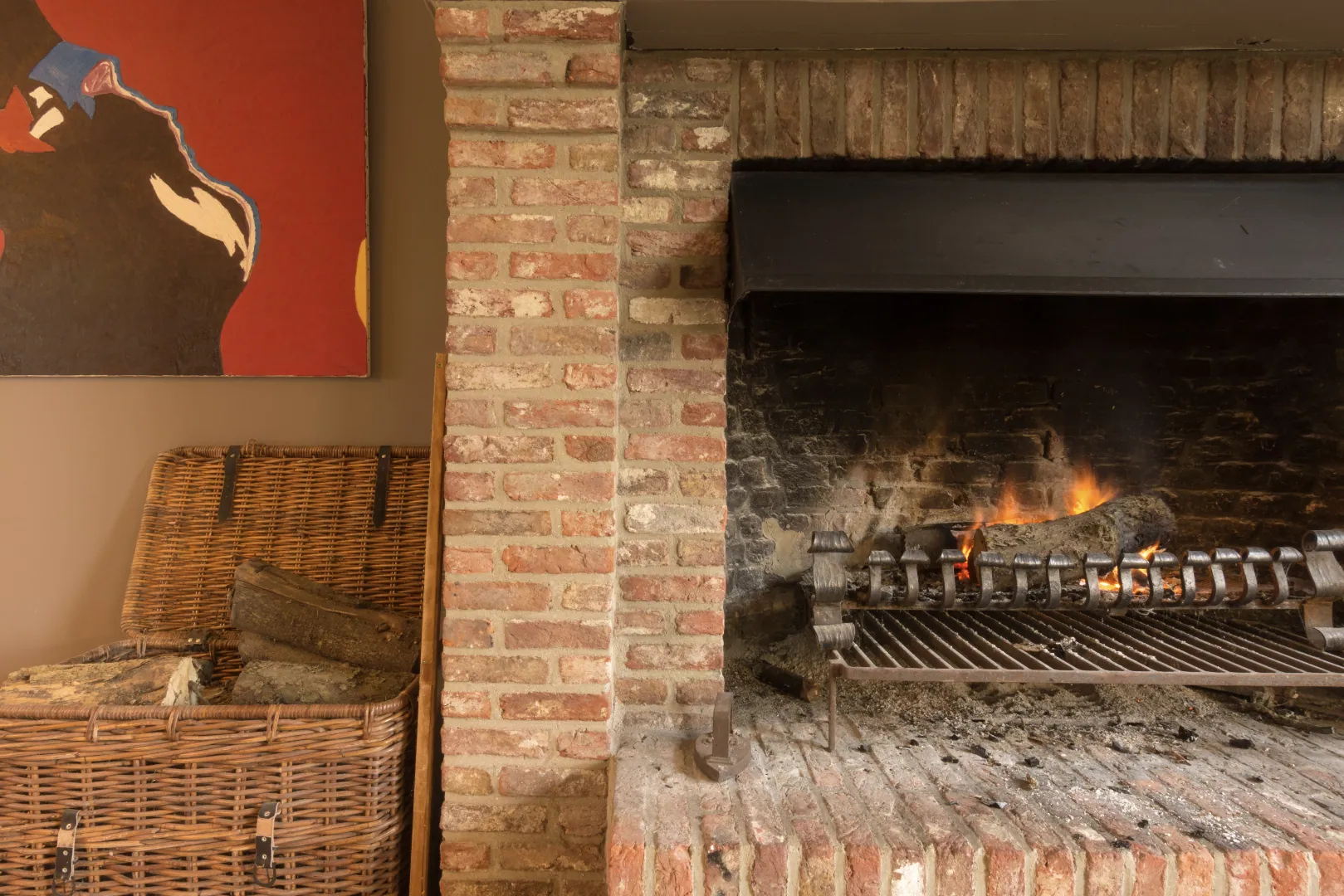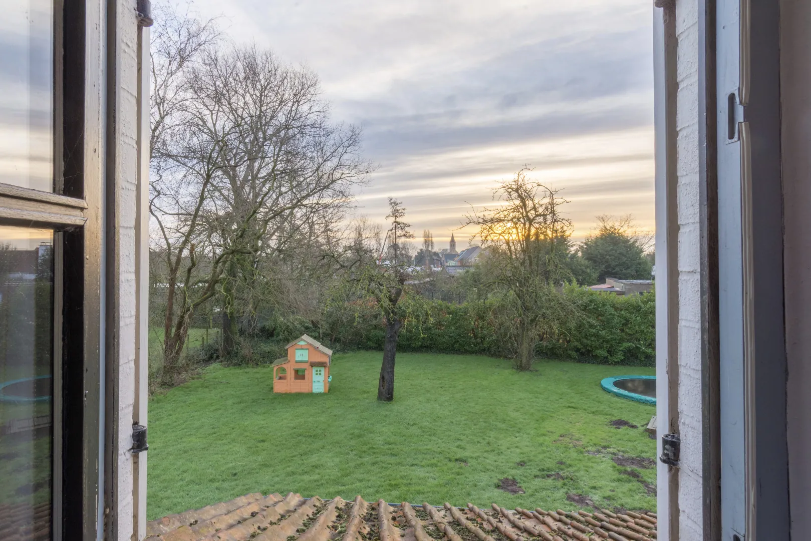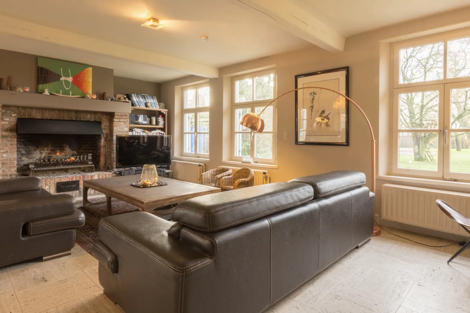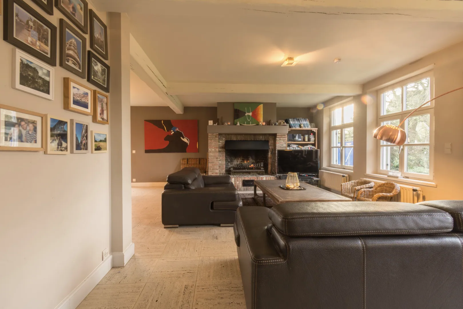 De lichtrijke leefruimte met overdekt terras kijkt zowel uit op de voor- en zijtuin als op de schuur. Een grote open haard geeft sfeer en is een ware aandachtstrekker in de ruimte.