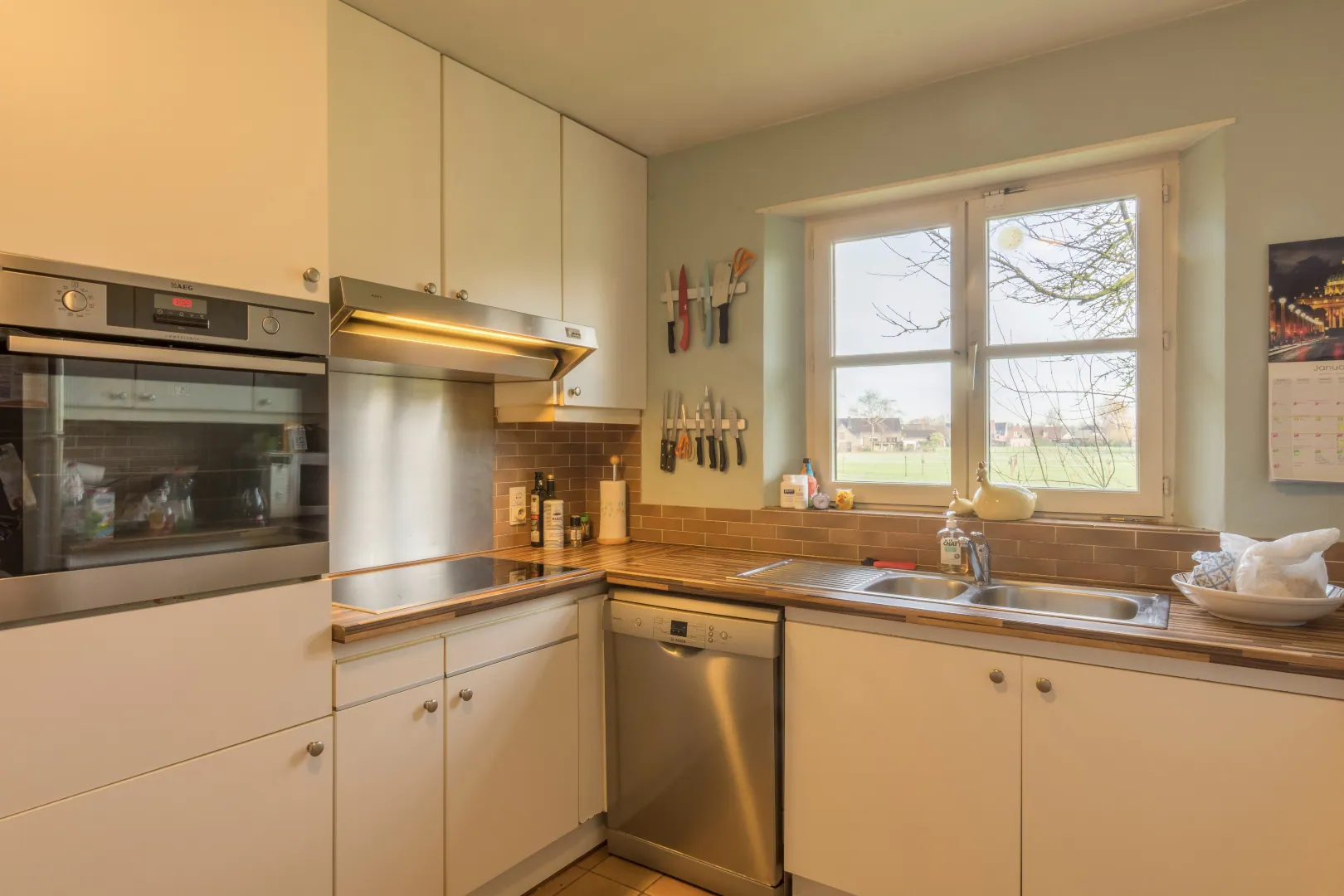 De naastgelegen gesloten keuken heeft nieuwe inbouwtoestellen en kijkt uit op de achtergelegen (paarden)weiden.