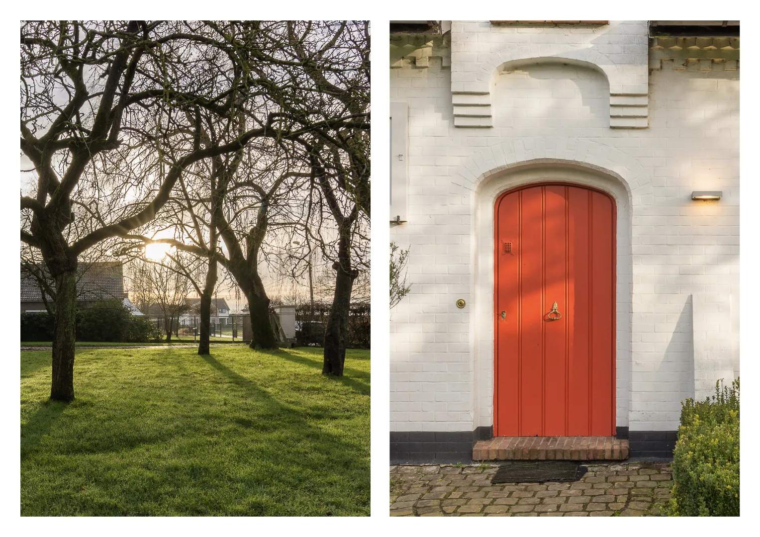 De oprit en wandelpad in kasseien leidt naar de kenmerkende rode voordeur. De inkomhal heeft een open trap en staat centraal in de woning.