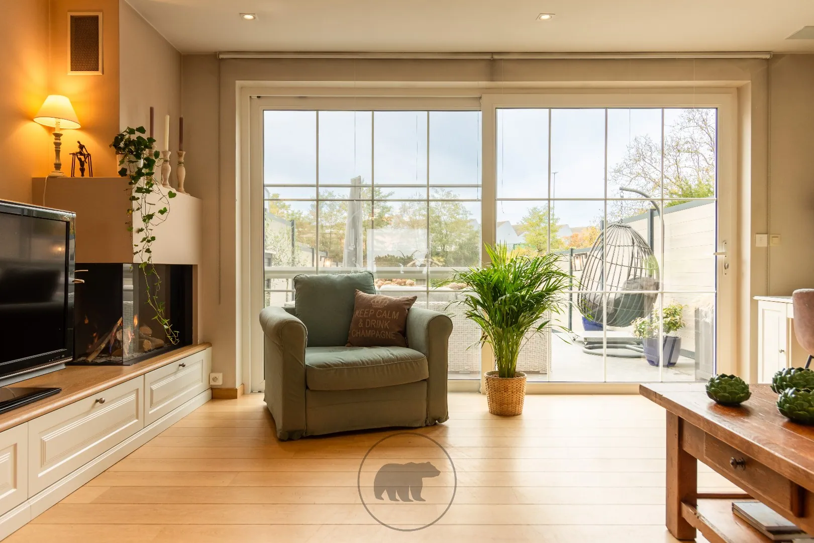 Op het gelijkvloers valt meteen de warme en hoogwaardige afwerking op. De living met gashaard (Faro) is uitgerust met maatkasten en een mooie parketvloer. De keuken, gerealiseerd door Freja interior concepts uit Bekkevoort, is een absolute blikvanger: maatwerk tot in de finesse, een granieten werkblad dat duurzaamheid en klasse uitstraalt en hoogwaardige Miele- en Atag-toestellen. Deze leefruimtes sluiten aan op het terras met zicht op de diepe west-georiënteerde tuin. Achterin de tuin is er toegang tot het Brugbergpad met uitstekende wandel- en fietsverbindingen.