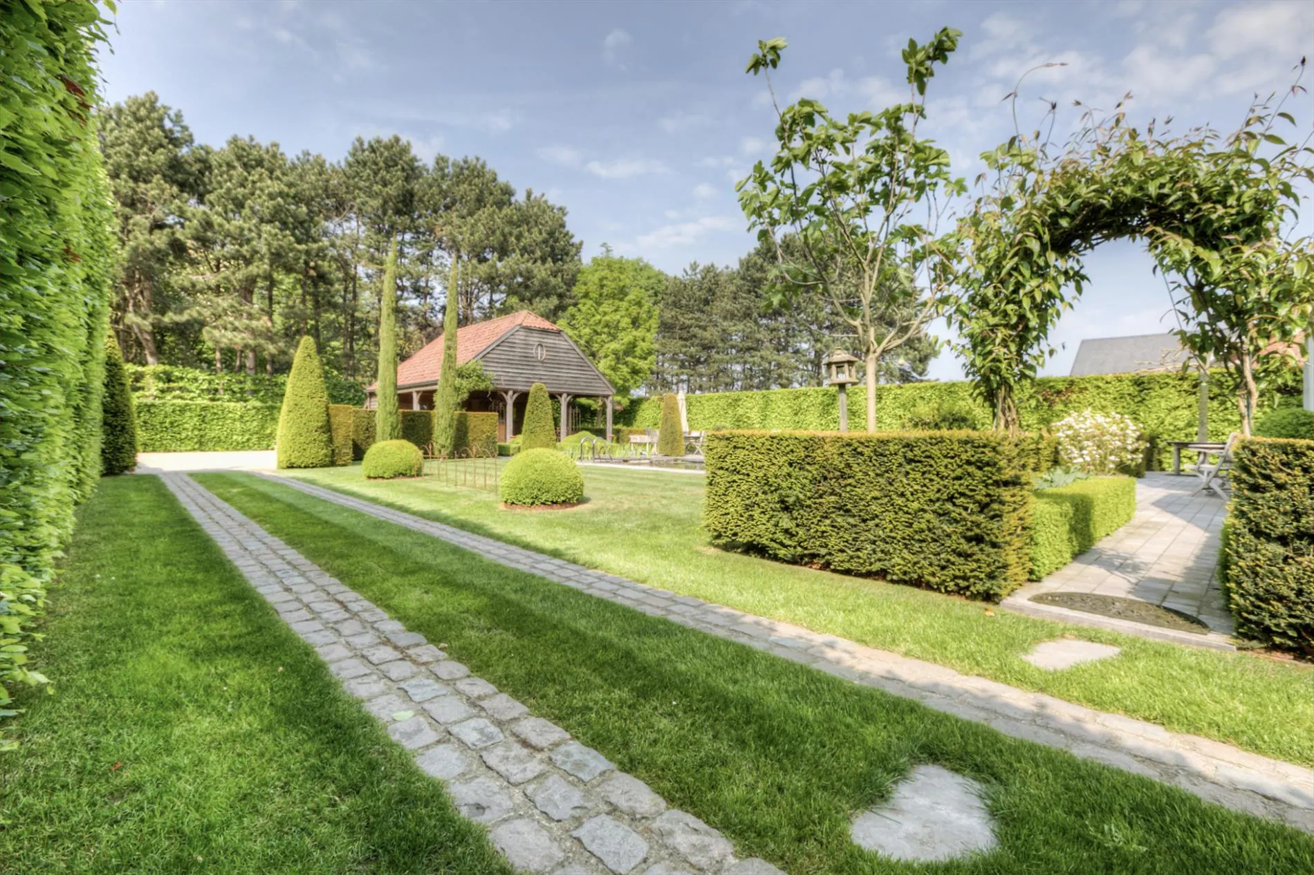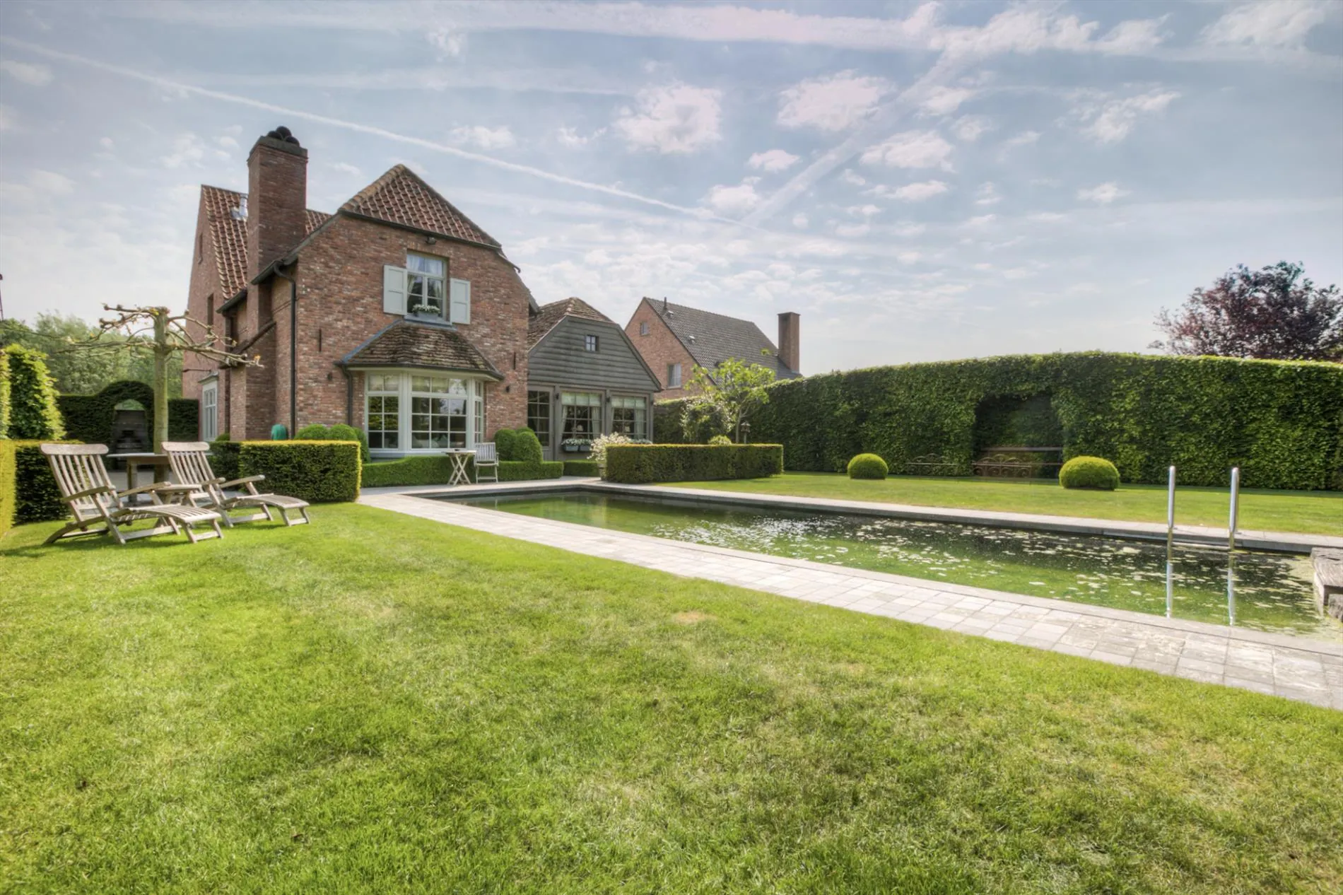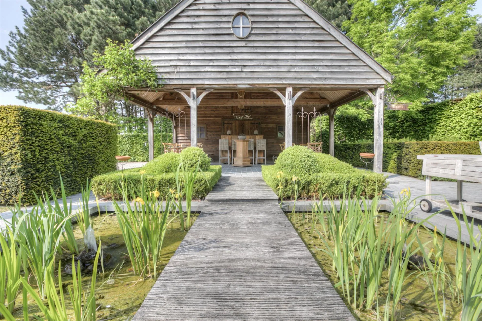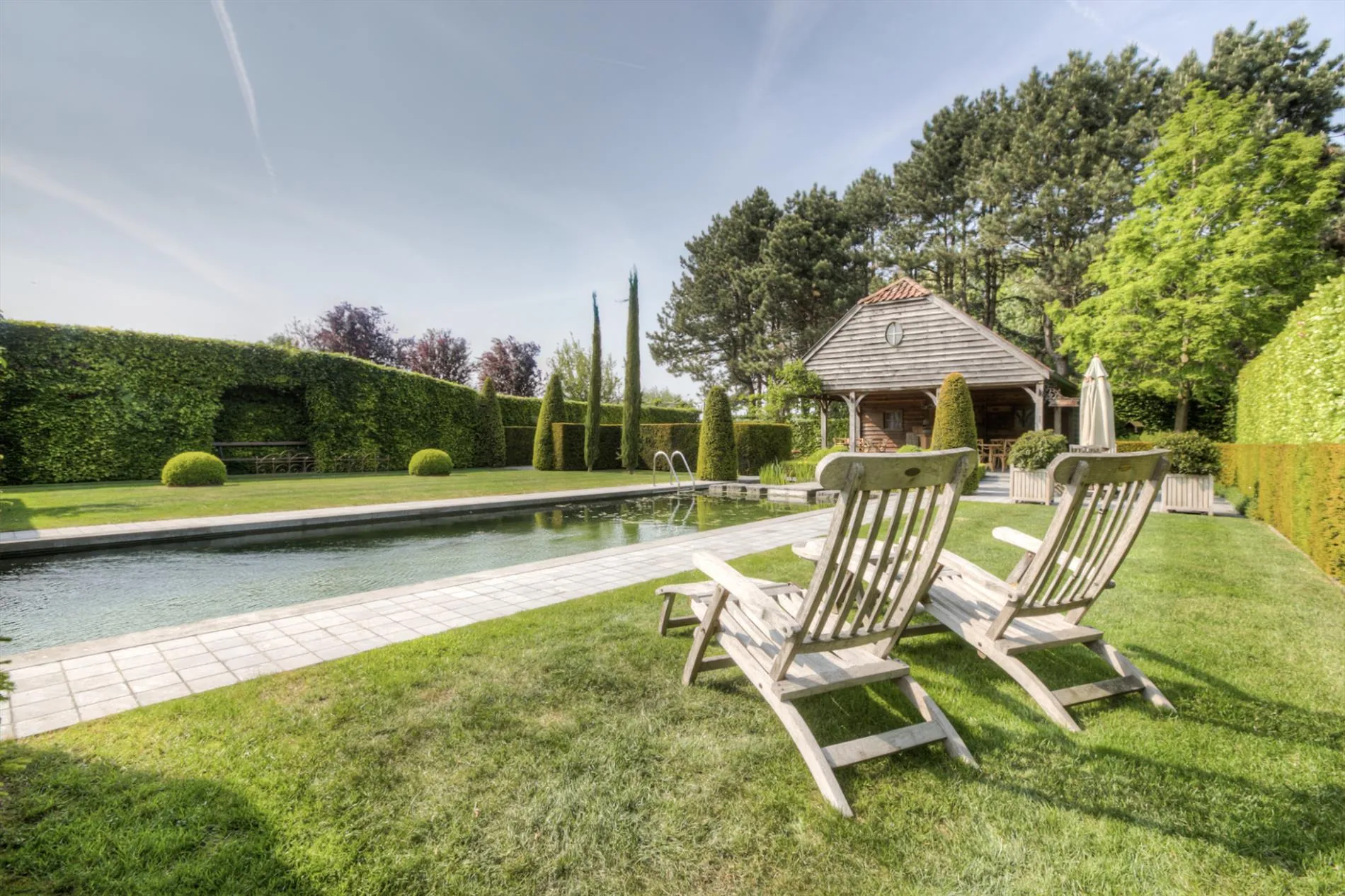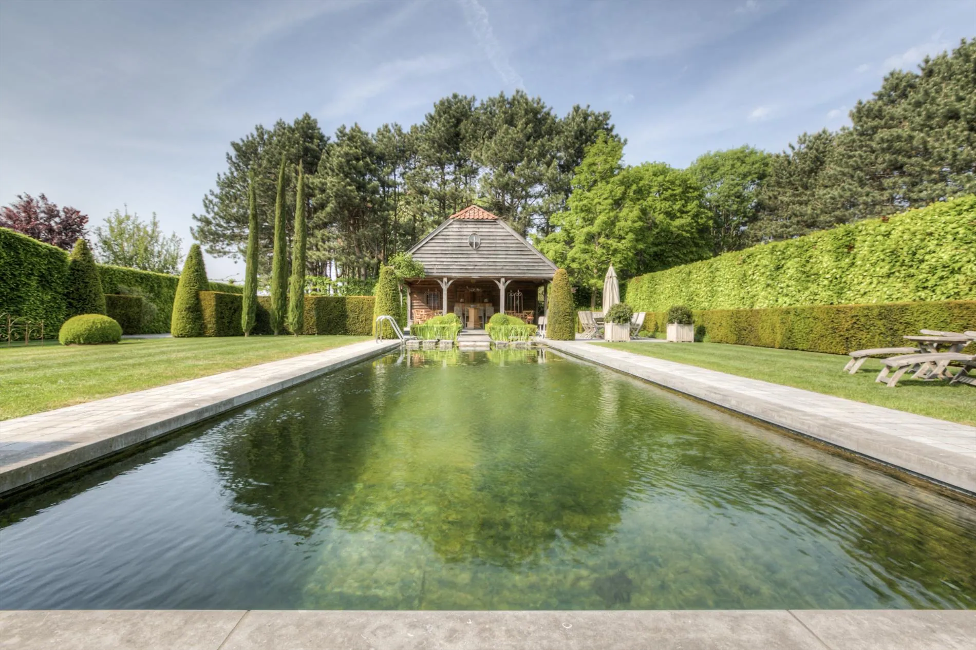 De aangelegde tuin, gekenmerkt door hagen van Beuk, Taxus en Buxus, heeft centraal een zwemvijver van 15m bij 4,5m en meerdere terrassen. Aansluitend omvat de tuin een eikenhouten poolhouse met dubbele carport en zijn er binnenin aansluitingen voorzien voor jacuzzi, sauna en sanitair.