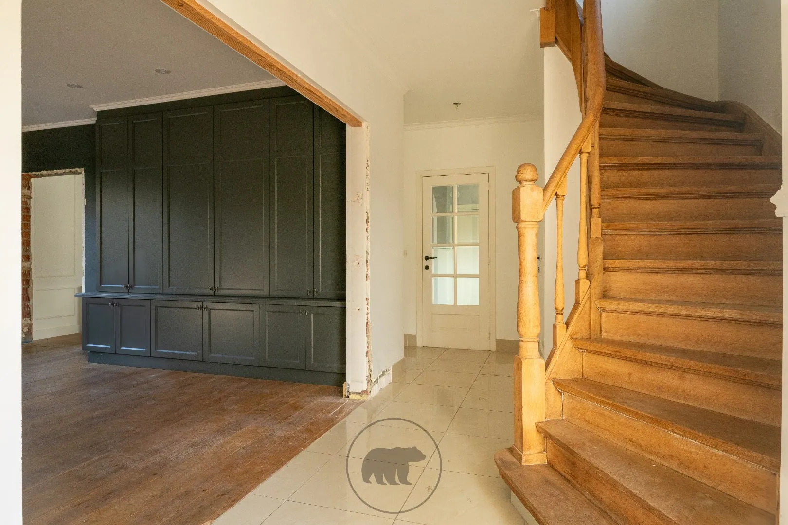 De gehele woning kent een goede ruimte-indeling met op het gelijkvloers een inkomhal met naastgelegen gastentoilet en bergruimte. Er is zowel directe toegang tot de ruime leefruimte met gashaard, als tot het bureel met maatkasten en de leefkeuken met berging.