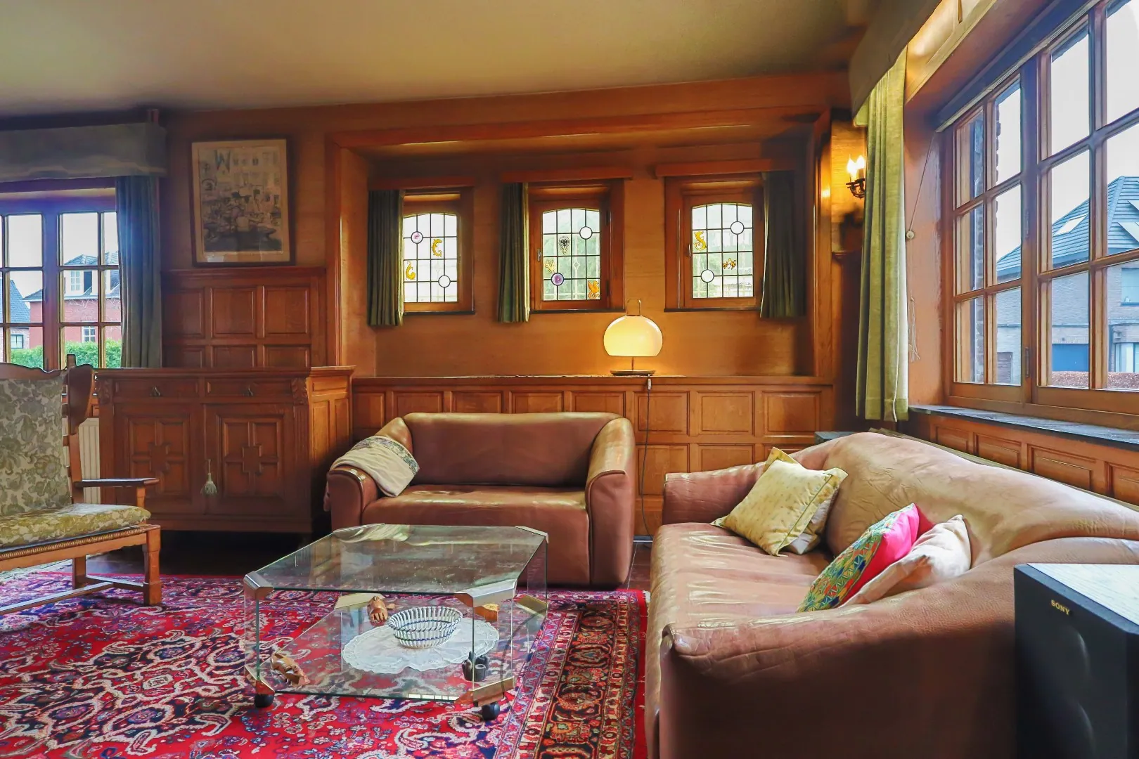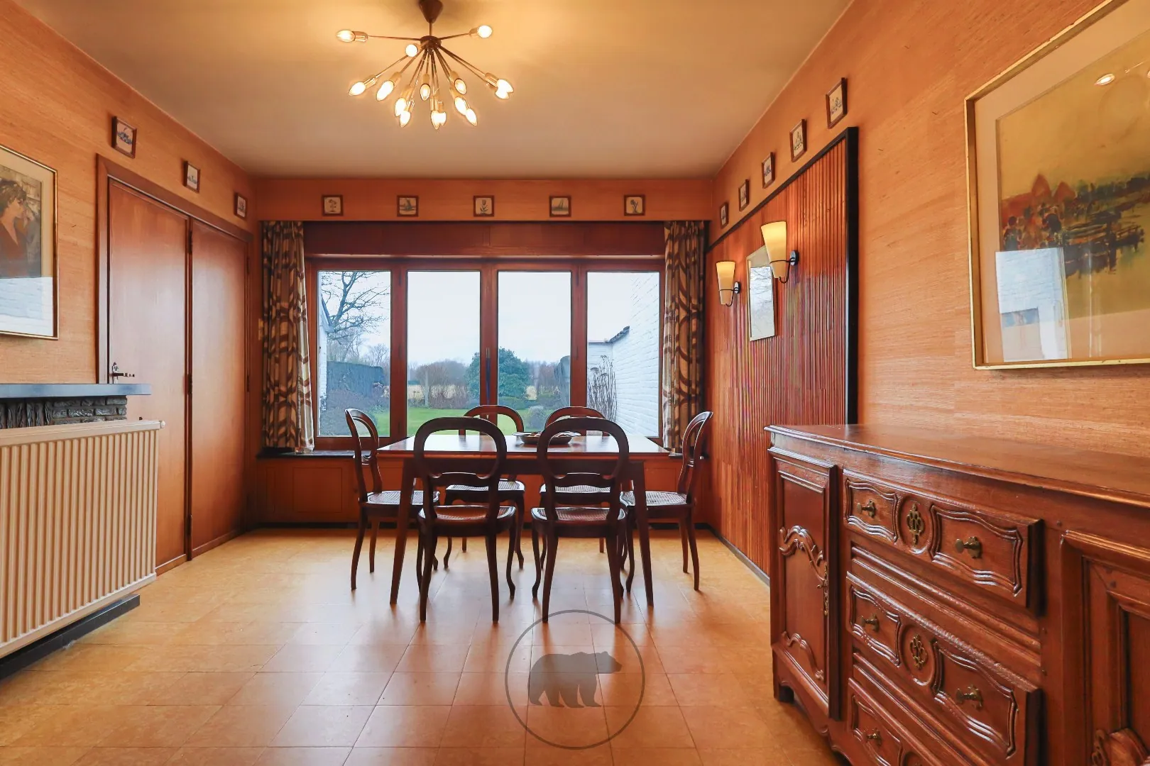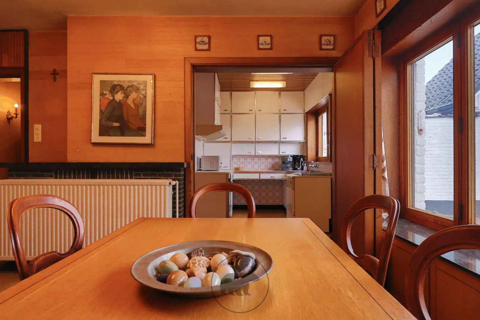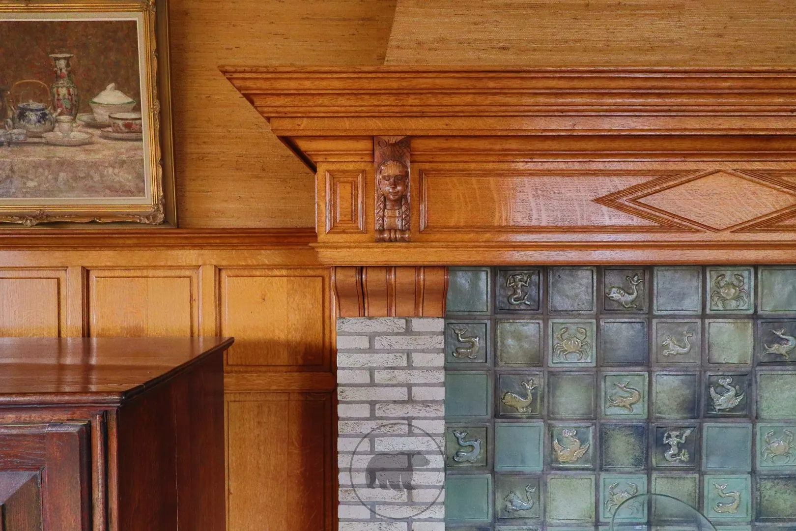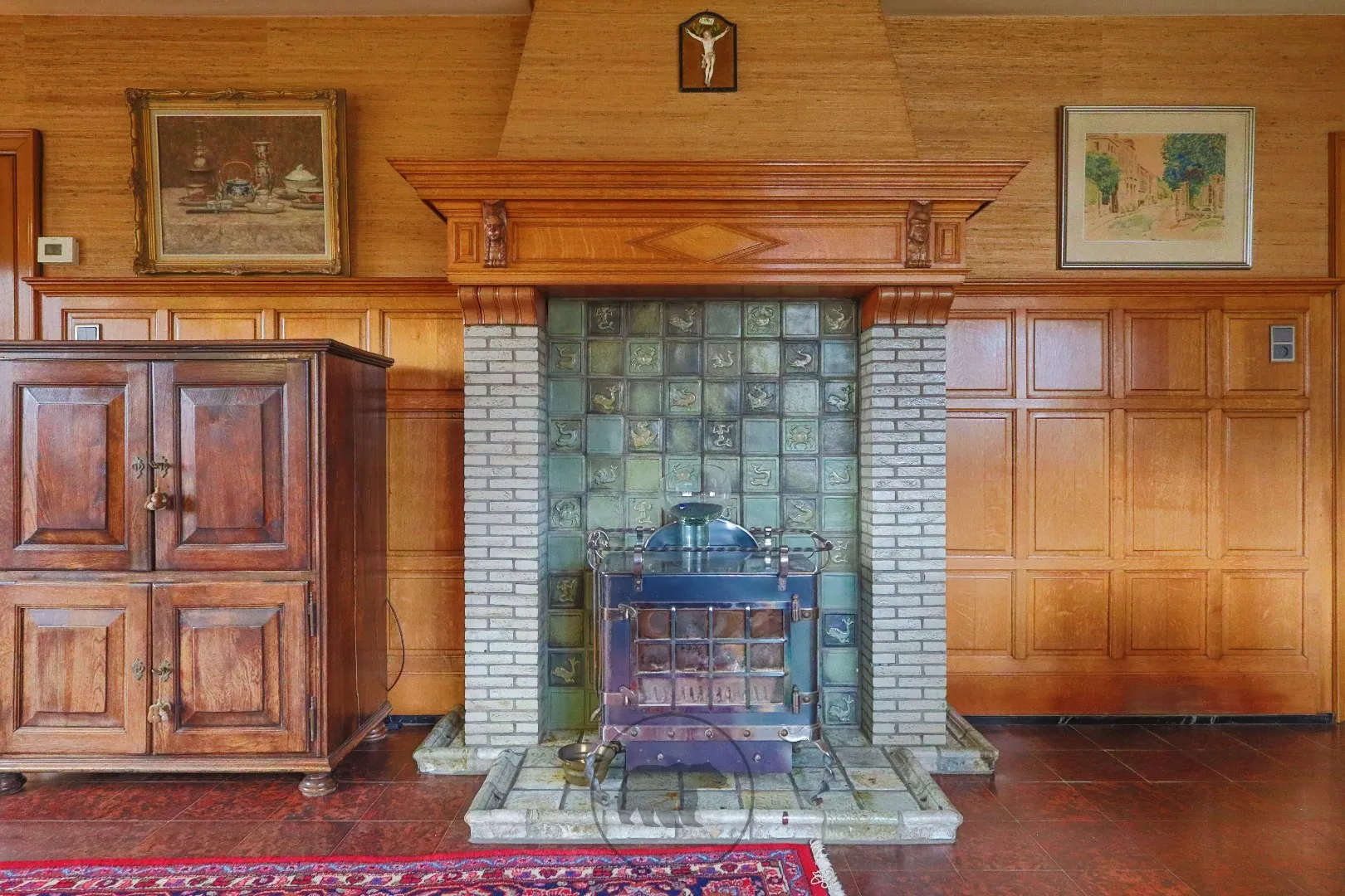 De inkomhal aan de zijgevel biedt toegang tot de living en de ruime eetplaats, beiden afgewerkt met houten lambrisering. De originele houten schouwmantel met decoratieve figuren voegt artistieke verfijning toe aan de voorplaats.