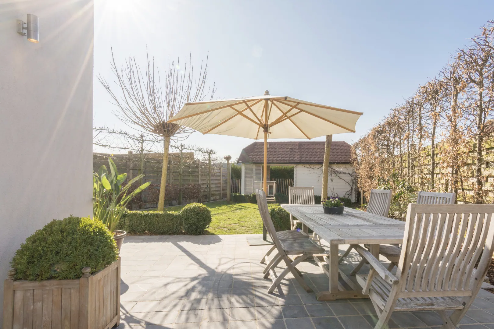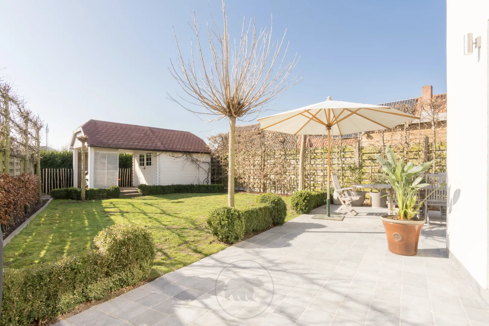 De zuidwest gerichte tuin met ruim terras is smaakvol aangelegd met oog op een maximaal geborgen gevoel, onderhoudsvriendelijkheid en verademing.