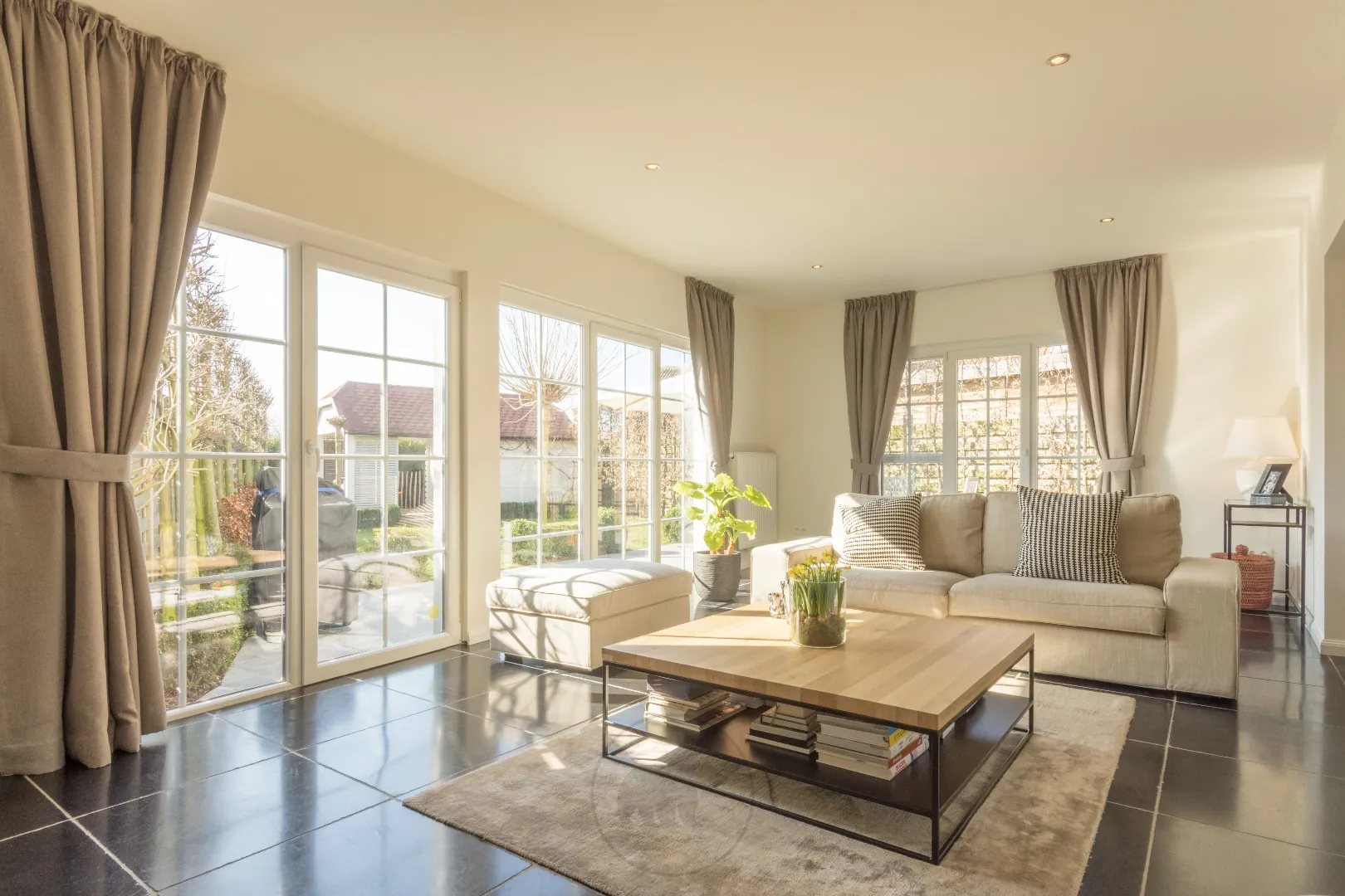 De open leefkeuken (kvik) is hypergeïnstalleerd en sluit mooi aan op de open leefruimtes. Aan lichtinval geen gebrek daar nagenoeg de gehele benedenverdieping kan genieten van direct zonlicht. Uitkijkend op de fraai aangelegde tuin werd een prachtige aanbouw gerealiseerd welke ingericht is als salon met elektrisch haardvuur.