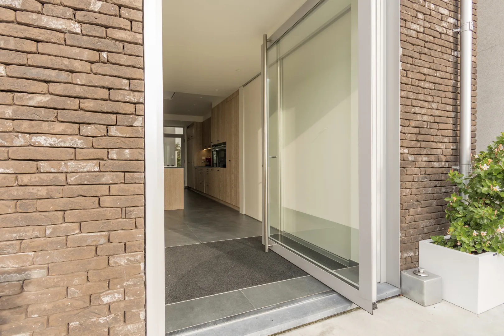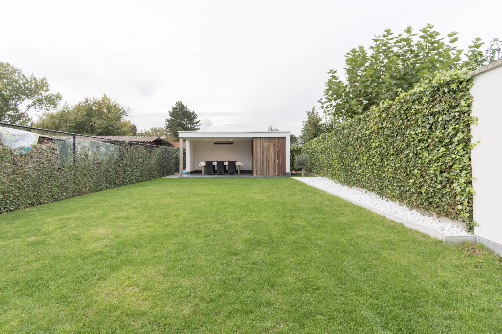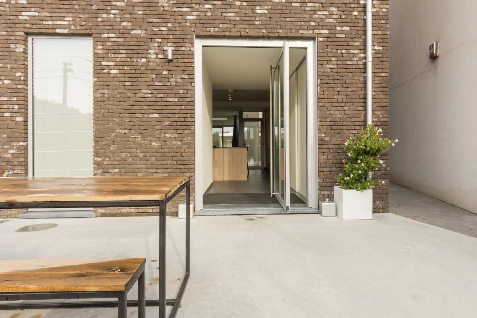 De oprit biedt plaats voor 2 wagens. Een elektronische toegangsdeur met videofoon geeft uit op het voorterras met overdekte fietsenstalling. De strakke betonvloer in combinatie met de ruwe gevelsteen en het aluminium schrijnwerk is bijzonder geslaagd! Via een zij-ingang en afzonderlijke toegangsdeur kan u rechtstreeks naar de fraai aangelegde achtertuin met tuinverlichting. Achterin het perceel staat een overdekt tuinterras met tuinberging. Het terras is voorzien van een verwarmingselement, spotjes en zelfs pre-installatie voor het monteren van een projector (buitencinema).
