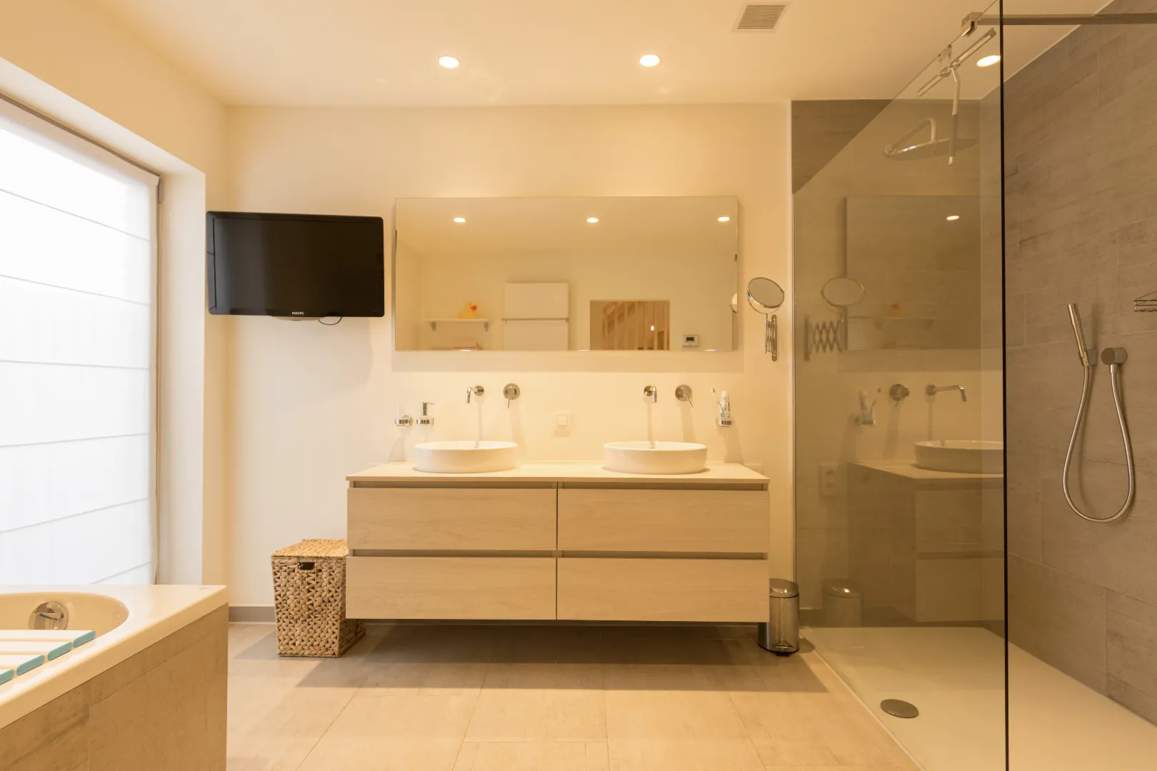 Op de bovenverdieping zijn er 2 slaapkamers waarvan 1 met dressing. Tussenin ligt een ruime badkamer met inloopdouche, nachttoilet, dubbele lavabo en een ligbad.
