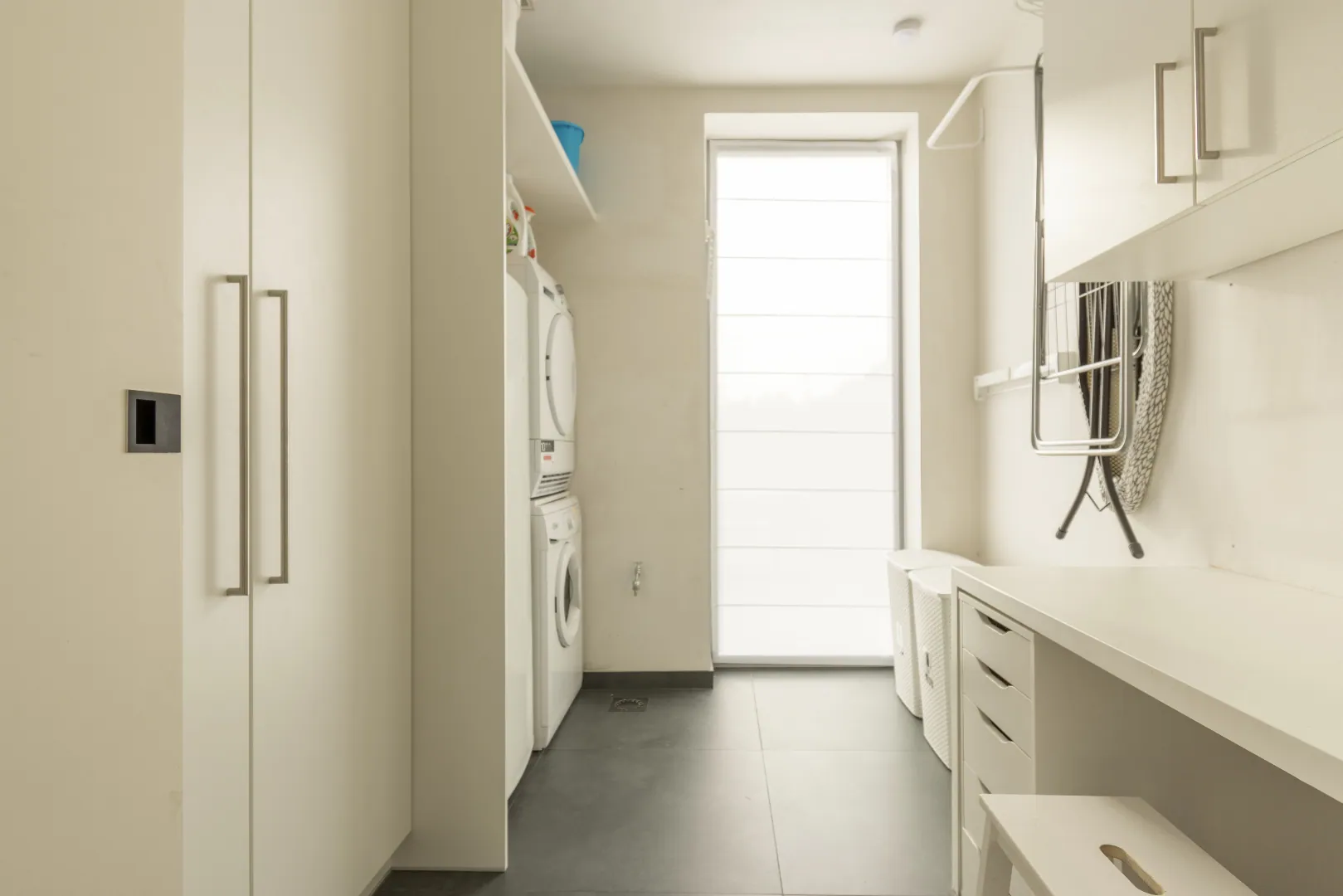 De ruimte onder de trap werd ingericht als bar-kast en afgewerkt met een stalen deur.