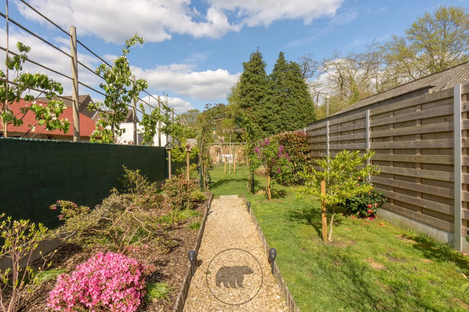 Links van de woning woning loopt een privatief wegeltje waardoor de tuin ook van buitenaf bereikbaar is voor bezoekers, om eenvoudig met de fiets achterom te geraken of voor het afvoeren van tuinafval.
