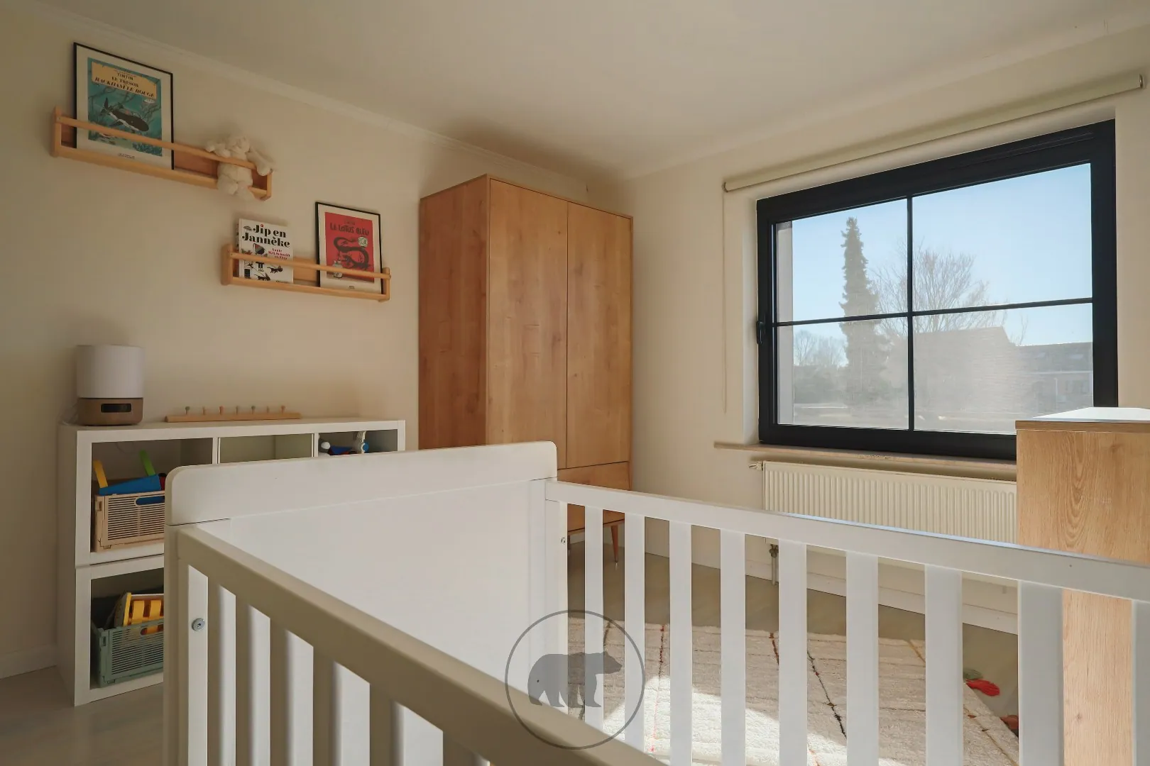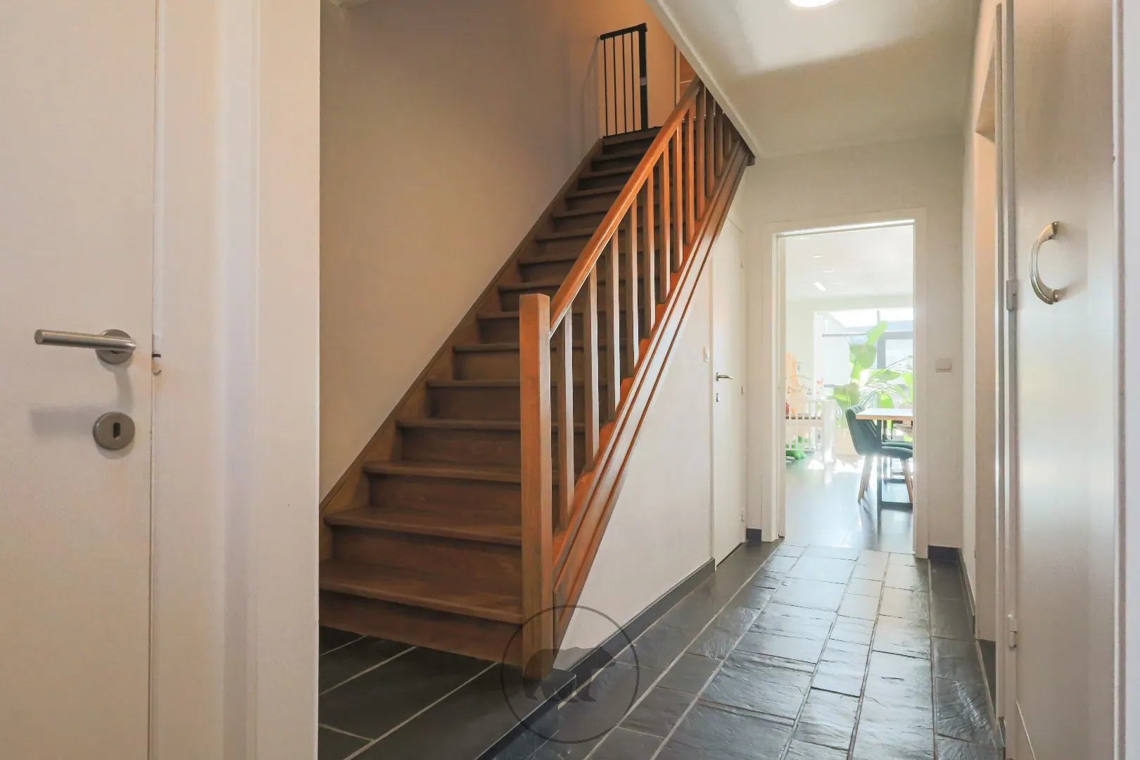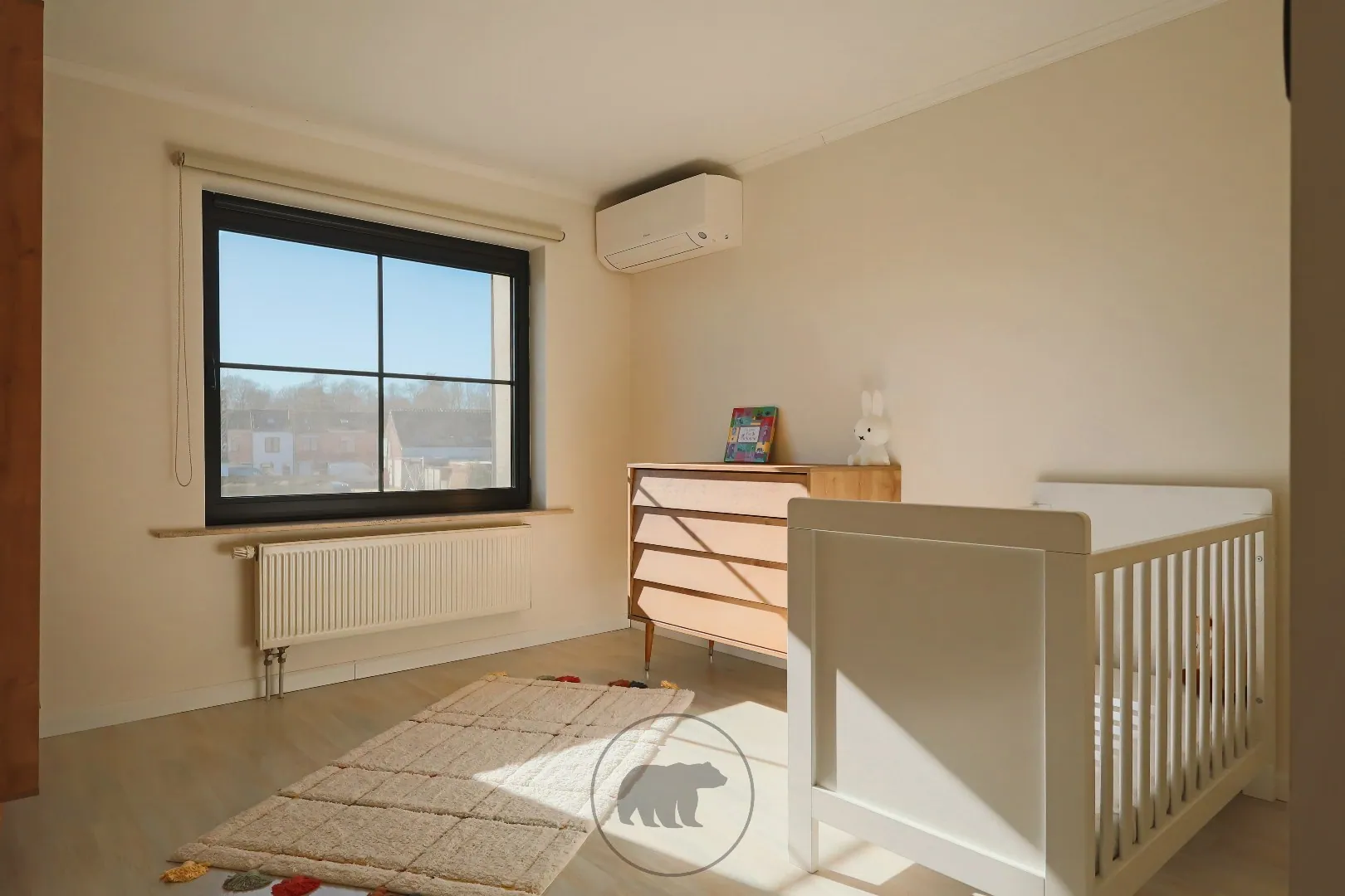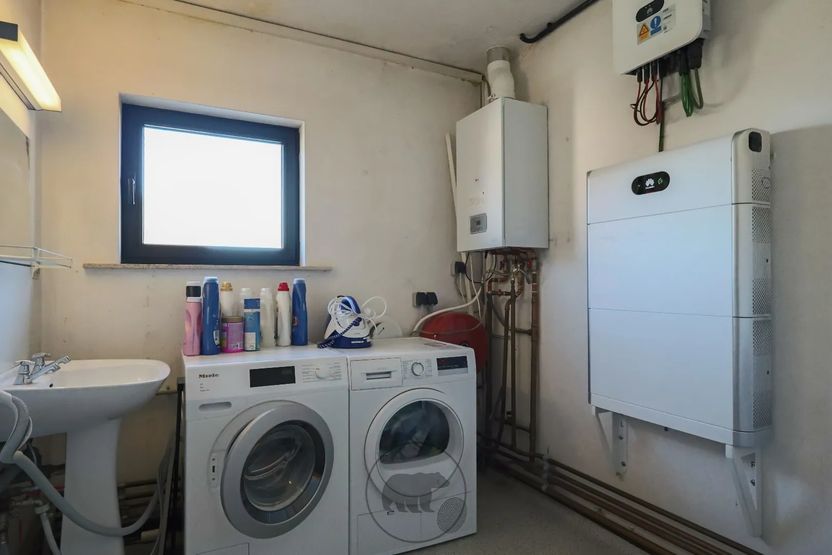 Een brede massieve trap leidt naar de eerste verdieping met 3 ruime slaapkamers voorzien van kwalitatieve laminaatvloeren. De kinderkamers achterin zijn bovendien uitgerust met airco. Grote raampartijen met vliegenramen zorgen ook hier voor de nodige lichtinval. De ruime badkamer heeft zowel een dubbele lavabo als een inloopdouche en hangtoilet. Tenslotte is er voorin een afzonderlijke wasplaats waar ook de omvormer van de zonnepanelen en de thuisbatterij werden geïnstalleerd.