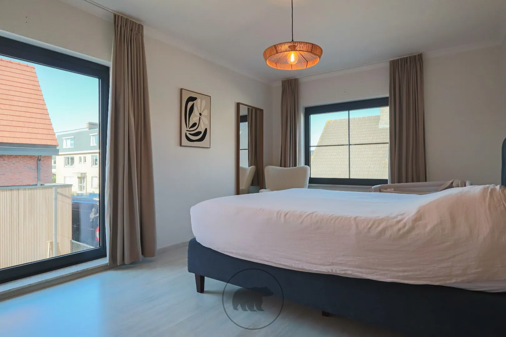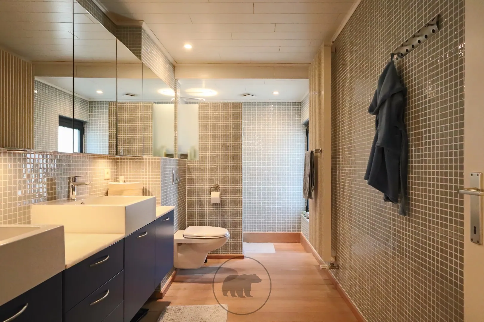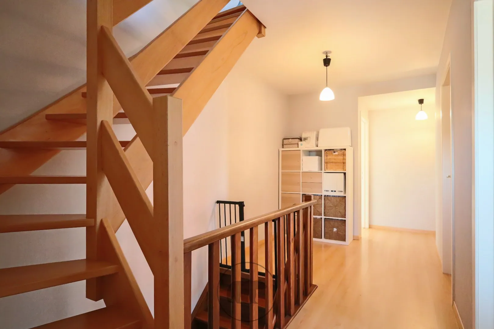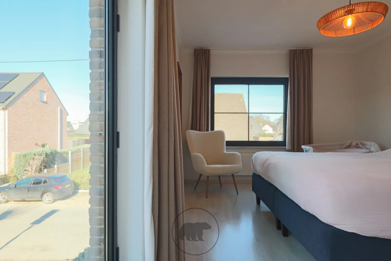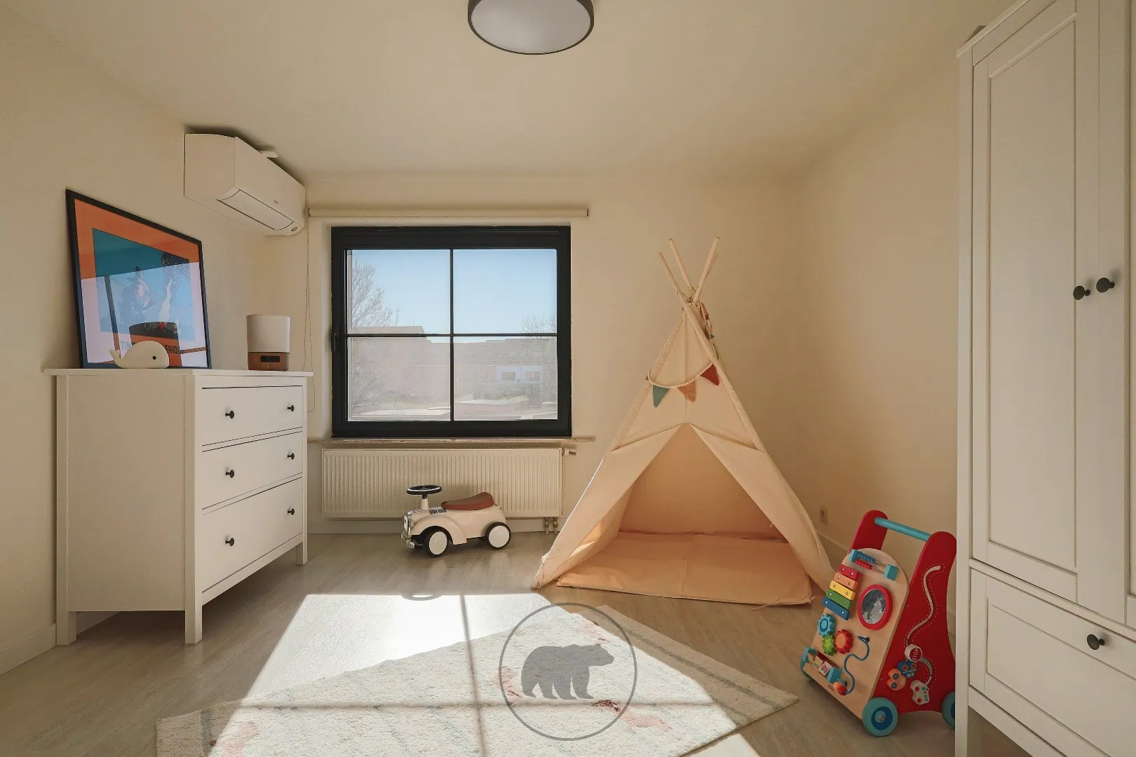 Een brede massieve trap leidt naar de eerste verdieping met 3 ruime slaapkamers voorzien van kwalitatieve laminaatvloeren. De kinderkamers achterin zijn bovendien uitgerust met airco. Grote raampartijen met vliegenramen zorgen ook hier voor de nodige lichtinval. De ruime badkamer heeft zowel een dubbele lavabo als een inloopdouche en hangtoilet. Tenslotte is er voorin een afzonderlijke wasplaats waar ook de omvormer van de zonnepanelen en de thuisbatterij werden geïnstalleerd.