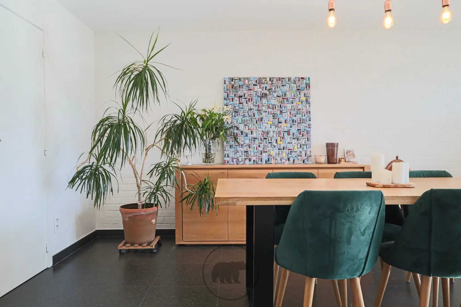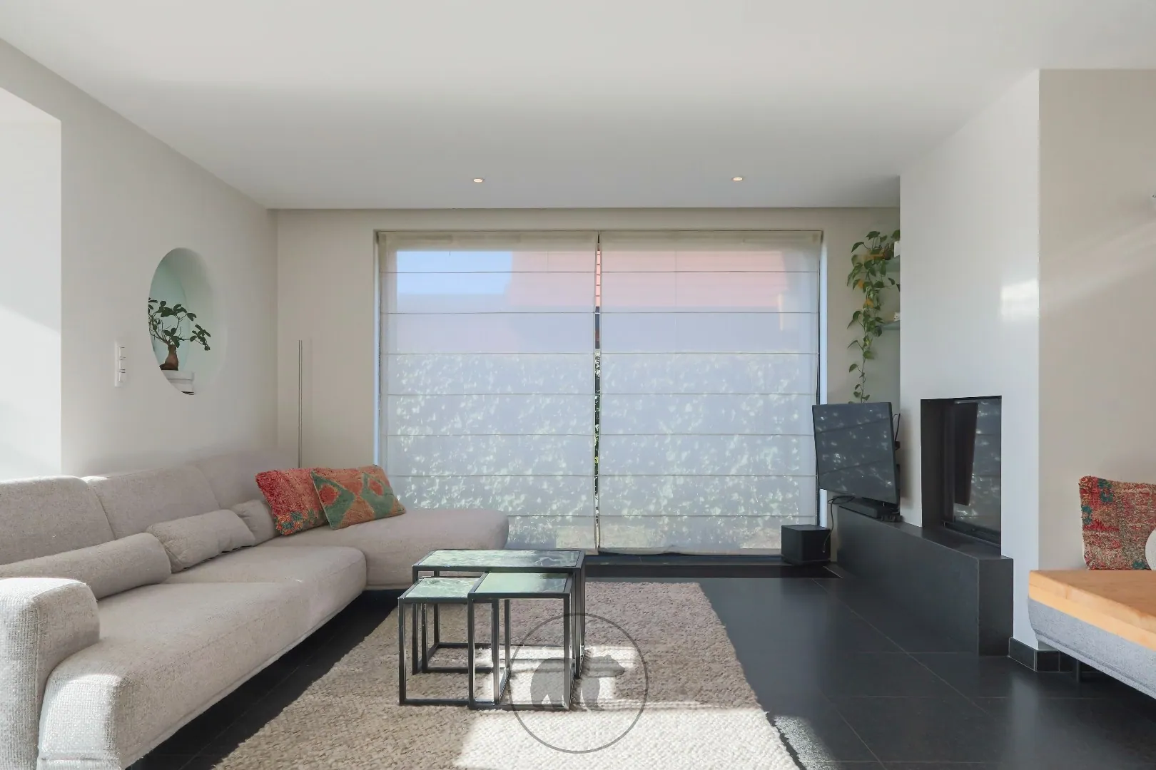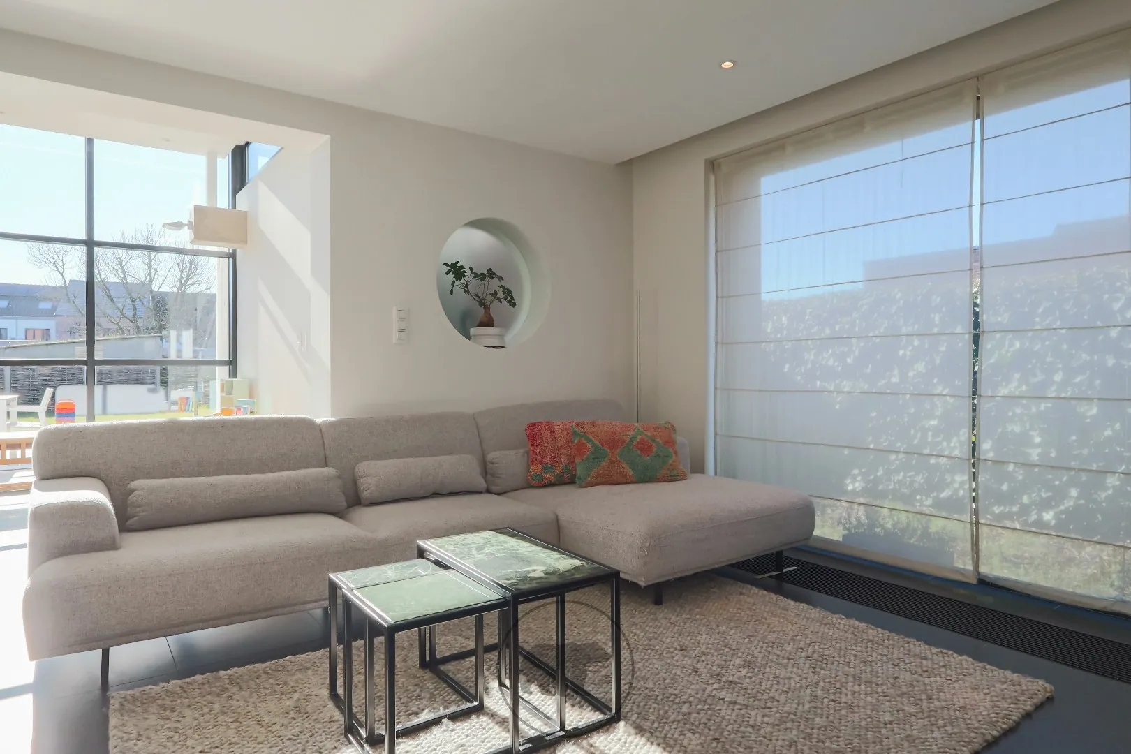 De leefruimte is erg lichtrijk dankzij de in glas opgetrokken achtergevel met een hoogte van 3,35m. Een afzonderlijke zithoek met houthaard zorgt voor gezellige momenten met het ganse gezin.