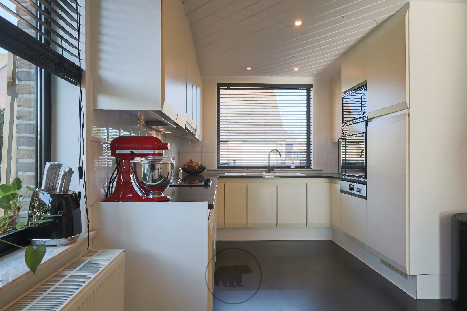 De leefkeuken voorin heeft veel bergruimte en is volledige uitgerust met inbouwtoestellen.